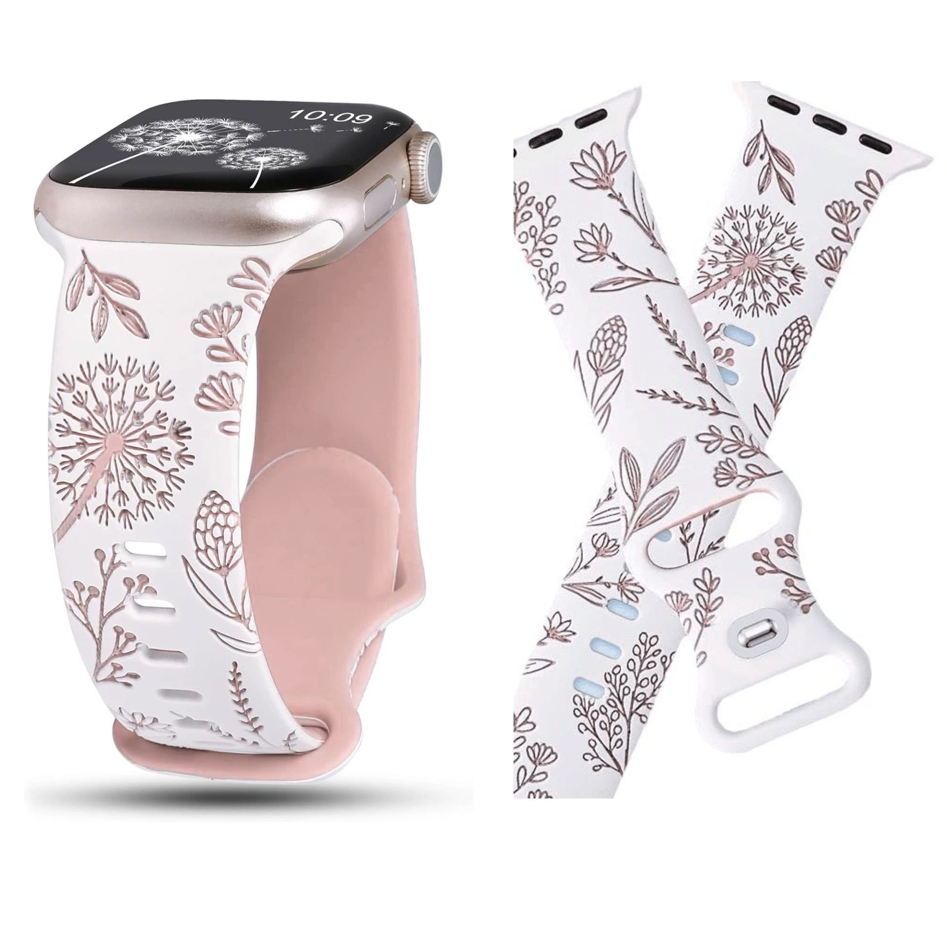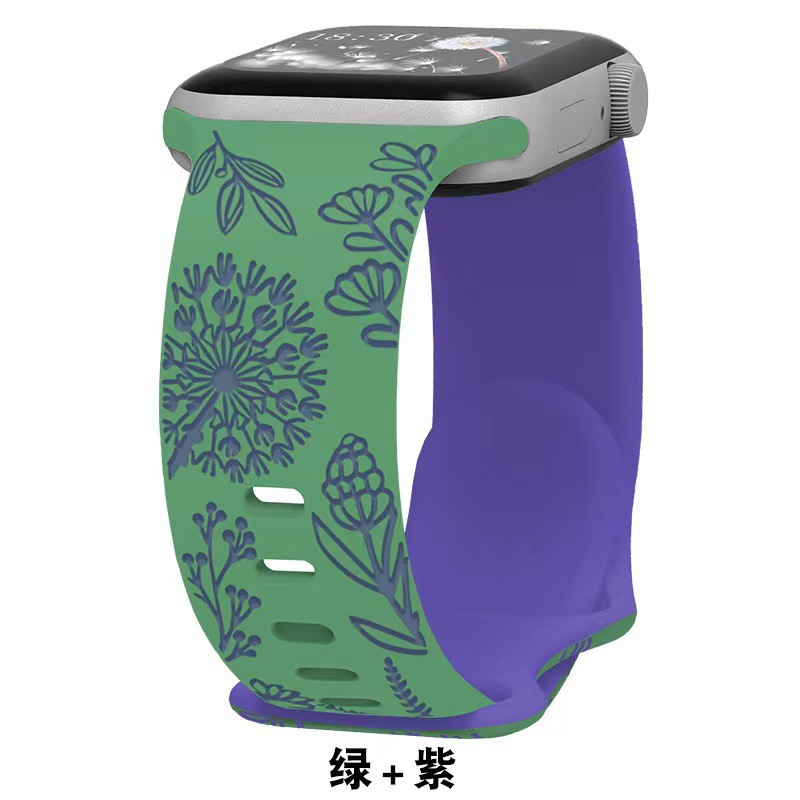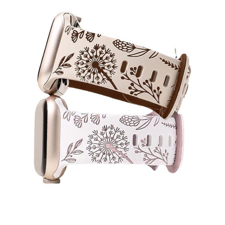 适用苹果3D镭雕激光雕花双色蒲公英硅胶蝴蝶扣表带8字扣双色雕花