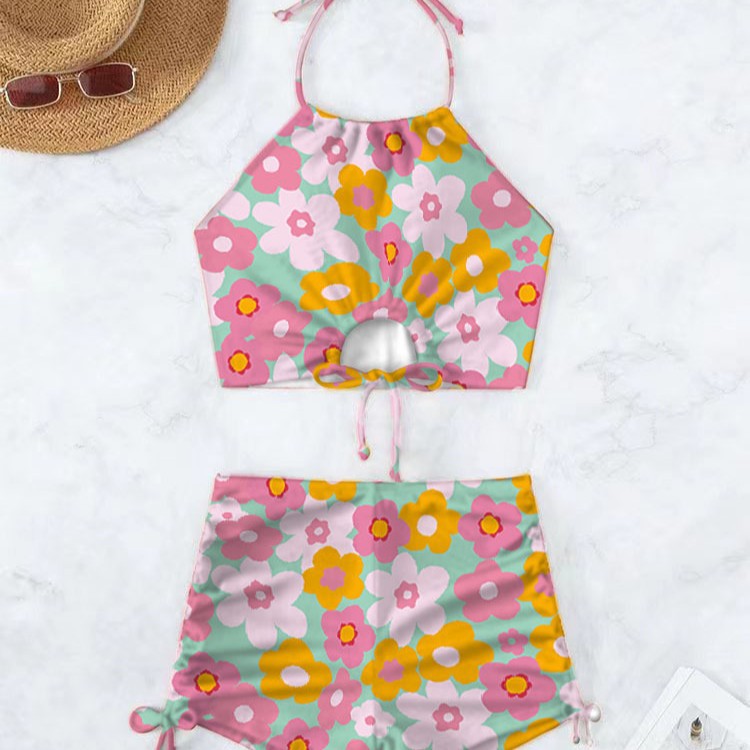 欧美分体泳衣女纯色温泉保守泳衣性感吊带绑带比基尼女亚马逊跨境