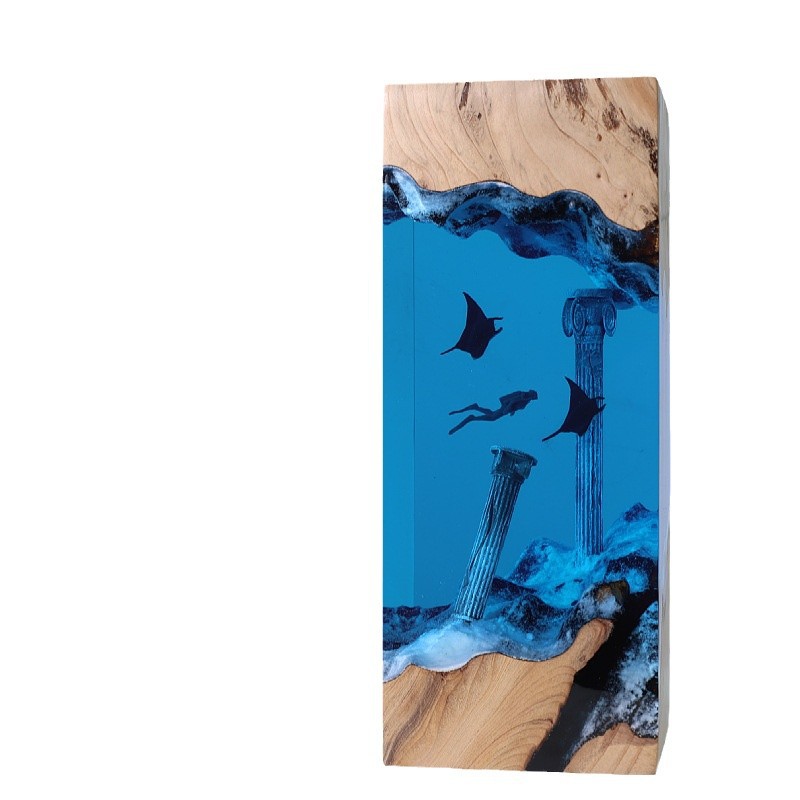 溶洞鲸鱼潜水员桌面摆件海洋艺术工艺品实木树脂灯生日礼物饰品