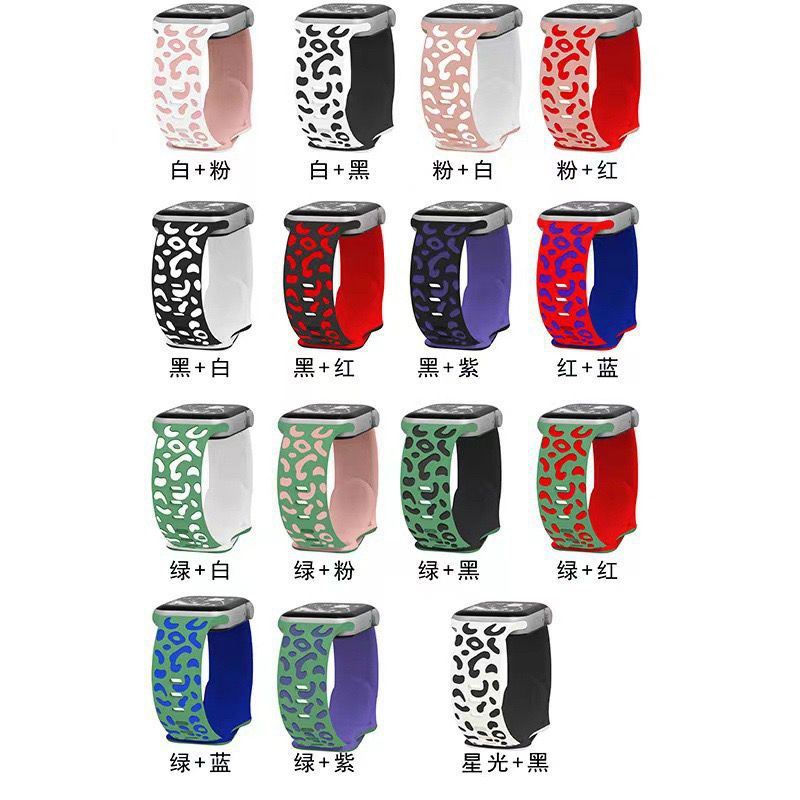 | 货号 | 苹果双色色镭雕豹纹表带 | 产品尺寸 | 女款38/40/41mm 男款 42/44/45/49mm |