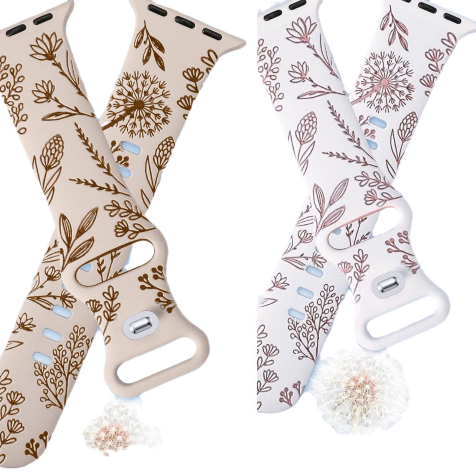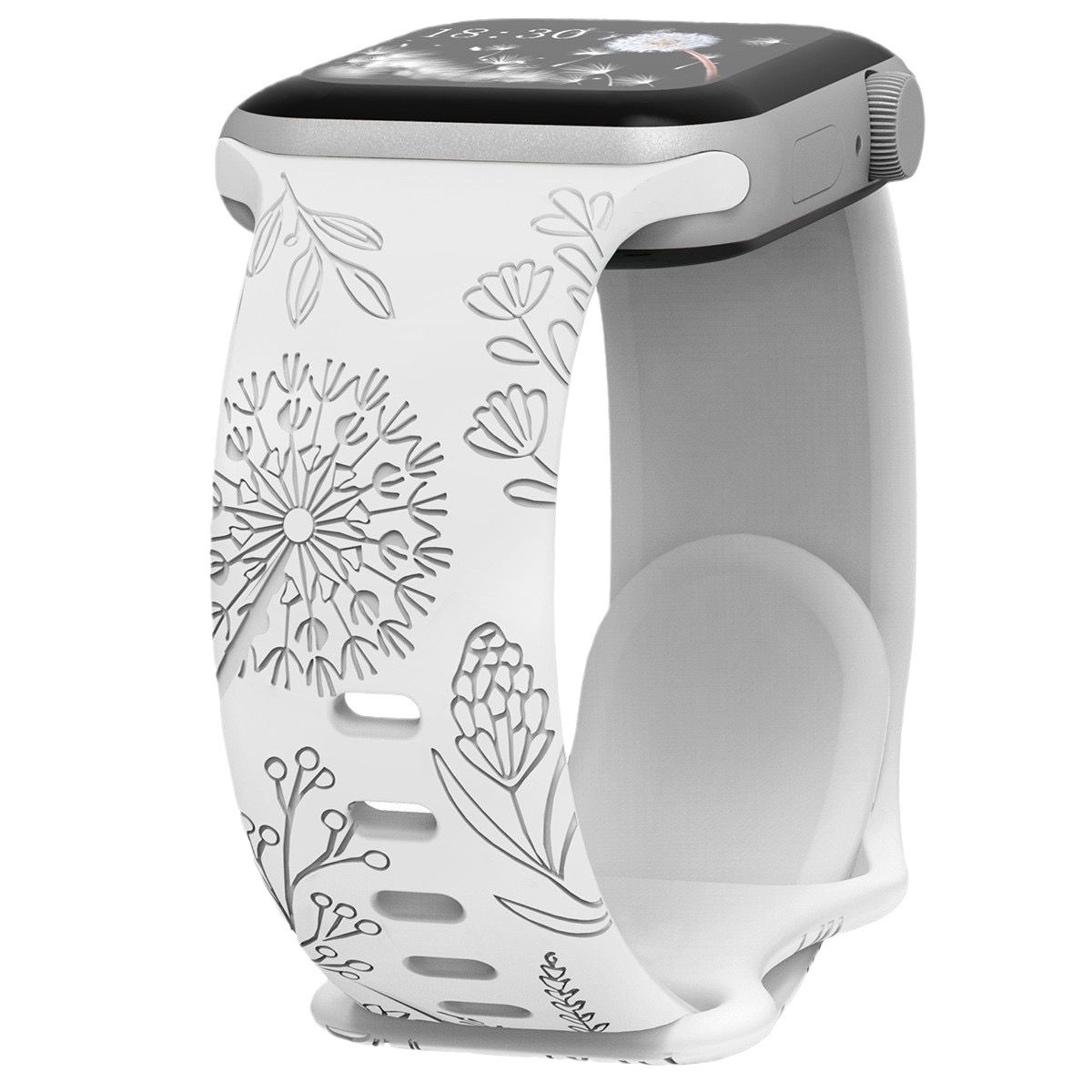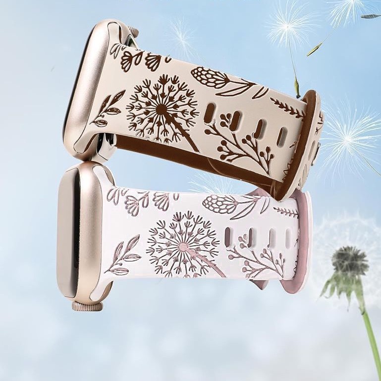 适用iwatch表带S8苹果表带单色蒲公英花朵雕刻花纹蝴蝶扣硅胶表带