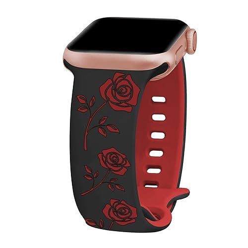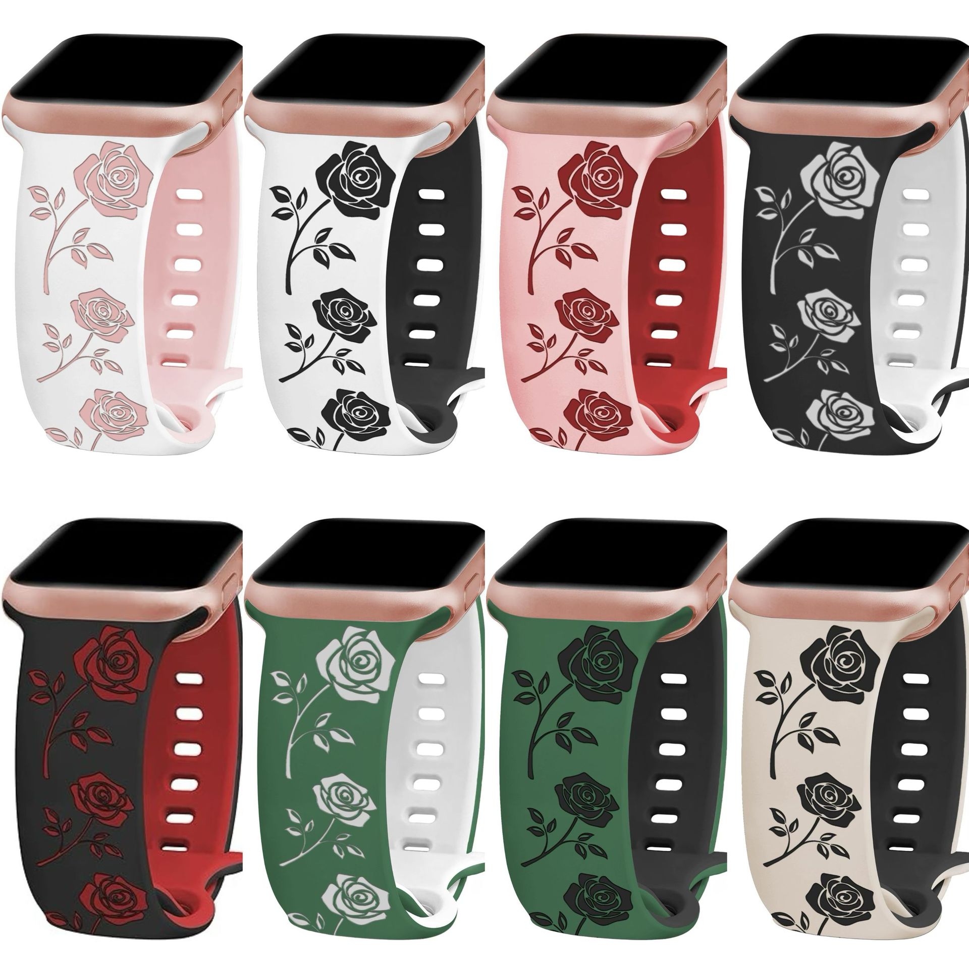 适用苹果3D镭雕双色玫瑰花激光雕刻硅胶蝴蝶扣表带8字扣双色雕花