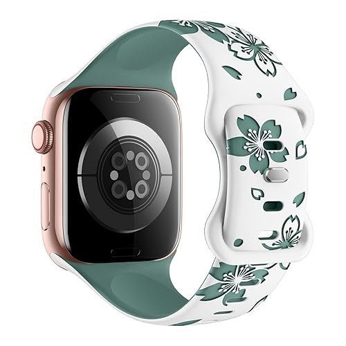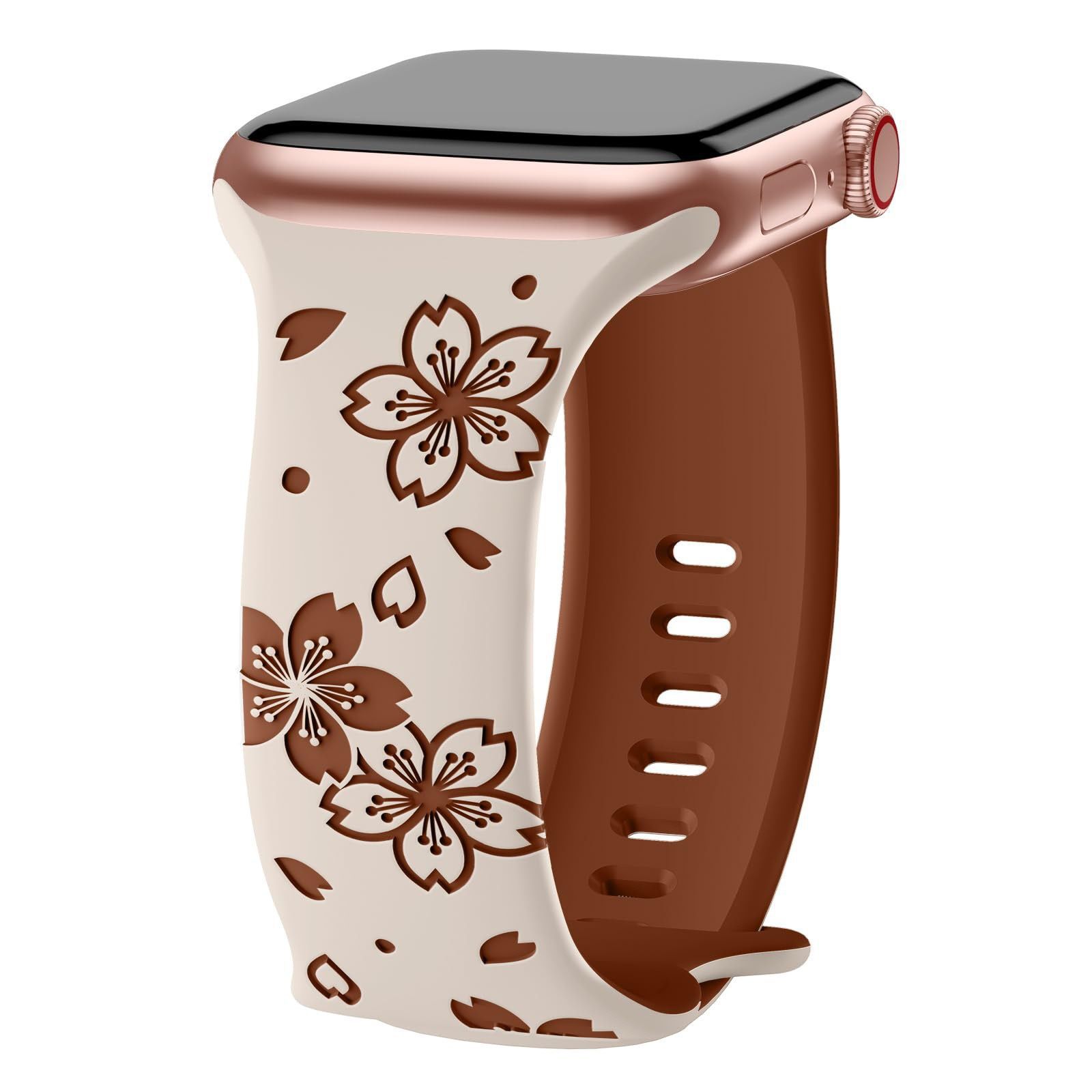 适用苹果3D镭雕激光雕花双色樱花硅胶蝴蝶扣表带8字扣双色雕花表