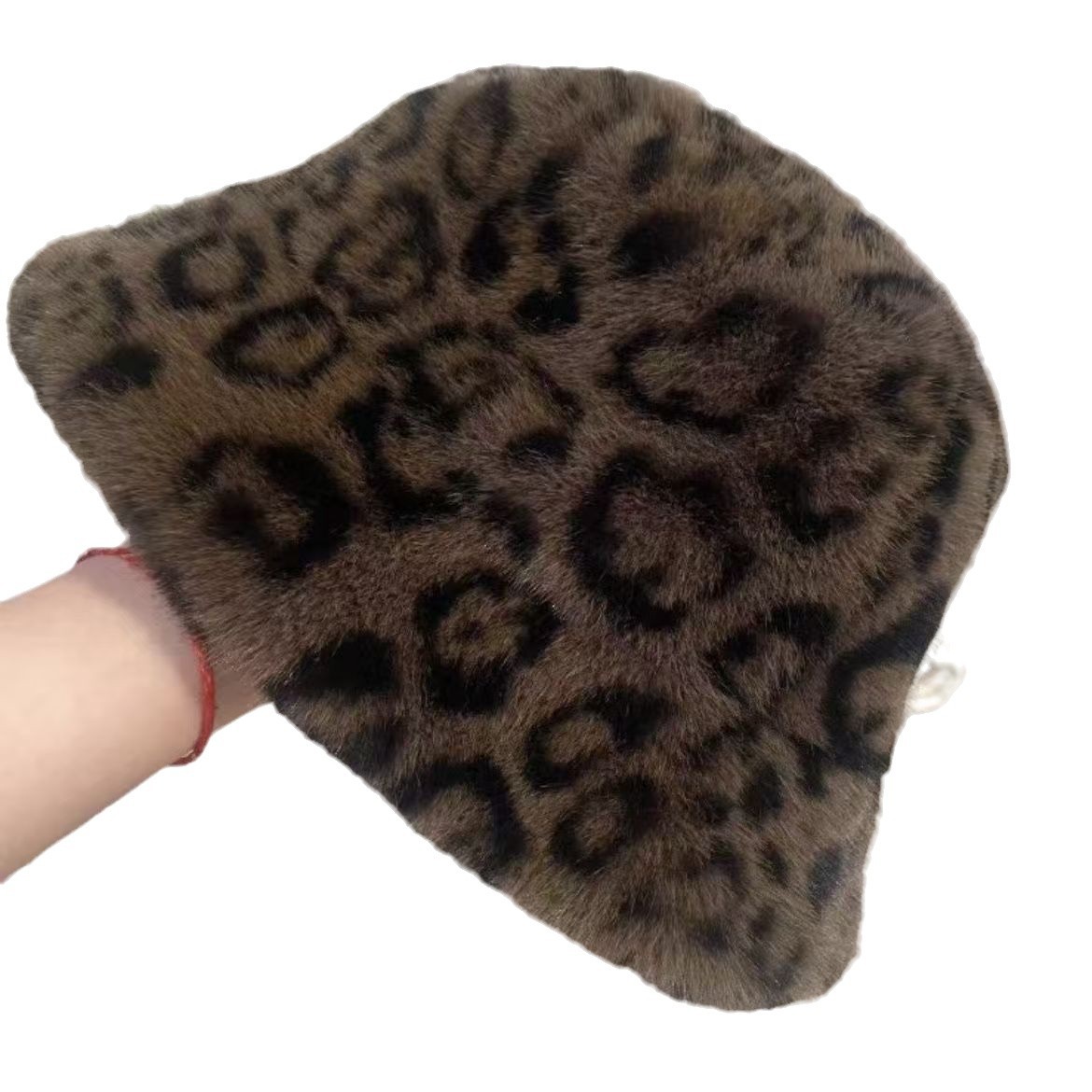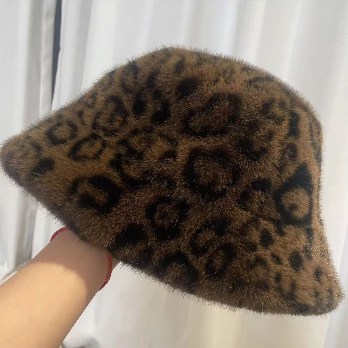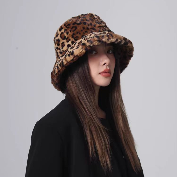 网红豹纹渔夫帽女秋冬新款时尚显脸小盆帽加厚保暖百搭毛绒帽厂家