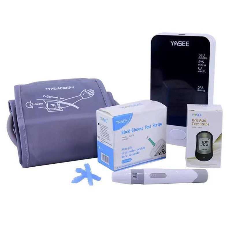 | 规格 | 三合一主机+臂带+采血笔 带1盒50张尿酸试纸 带1盒50张血糖试纸 带2盒50 针 | 规格 | 三合一主机1个机器+1 盒25尿酸试纸+1盒25血酮试纸+1盒GLS-71 血糖试纸+ 2盒采血针 |