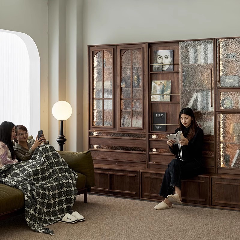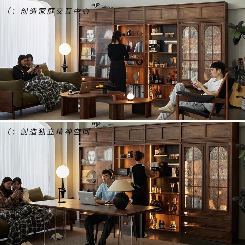 北美黑胡桃木整墙卡座书柜一体樱桃木书架自由组合客厅玻璃门书橱