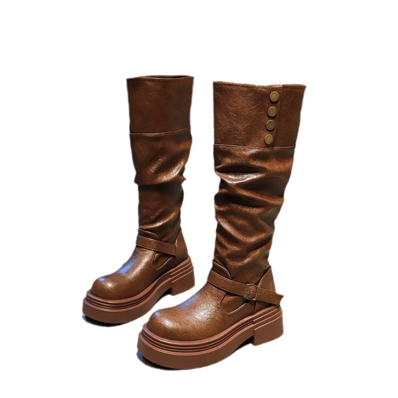 跨境外贸冬季长筒靴女2025新款厚底复古长靴堆堆靴英伦风粗跟骑士