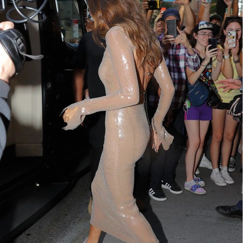 跨境明星同款高端性感露背名媛礼服裙珠片收腰长袖连衣裙女中长款