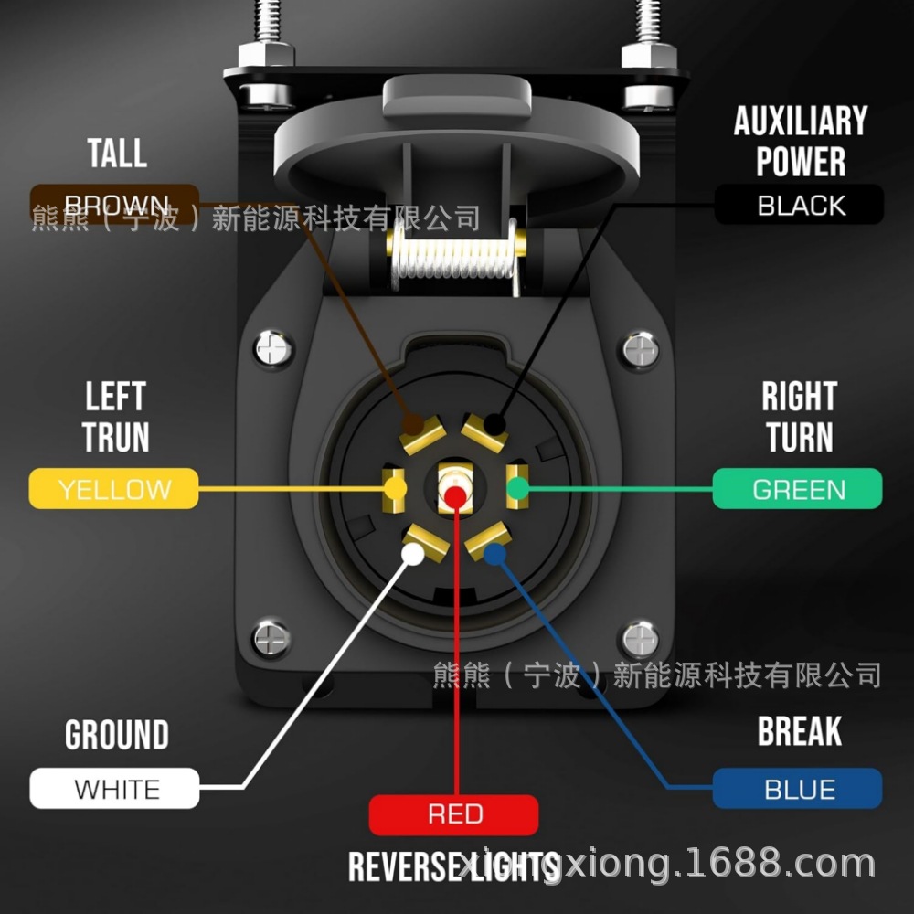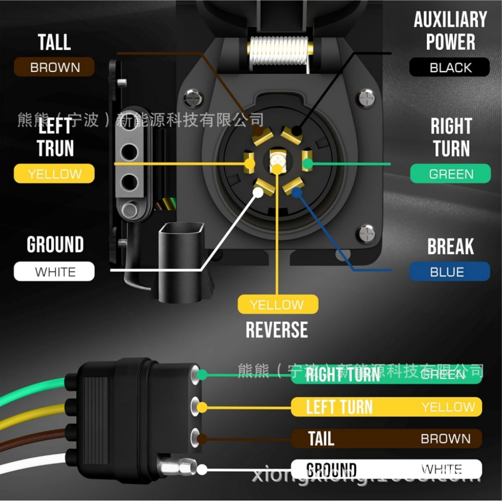 拖车的尾灯、刹车灯、转向灯、倒车灯、电动拖车制动器和辅助电源(12V+电线)供电。