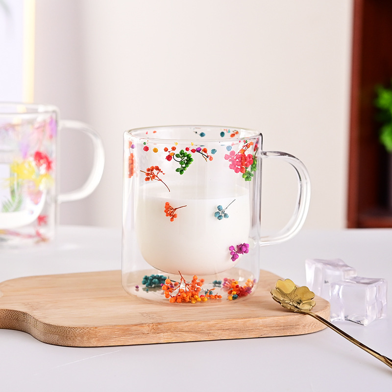 人气双层杯干花玻璃杯高颜值牛奶杯果汁杯咖啡杯通用高硼硅玻璃杯