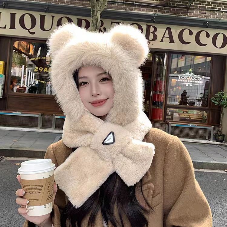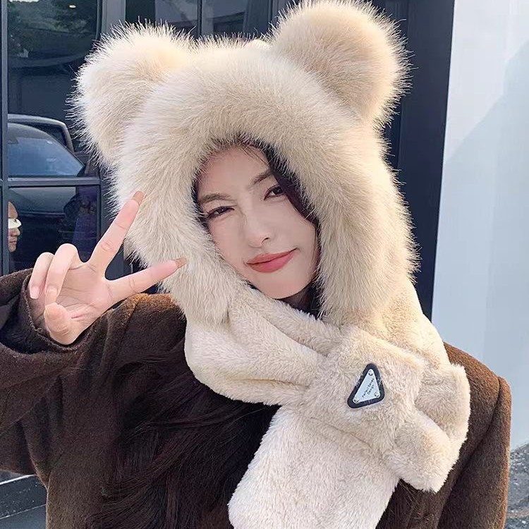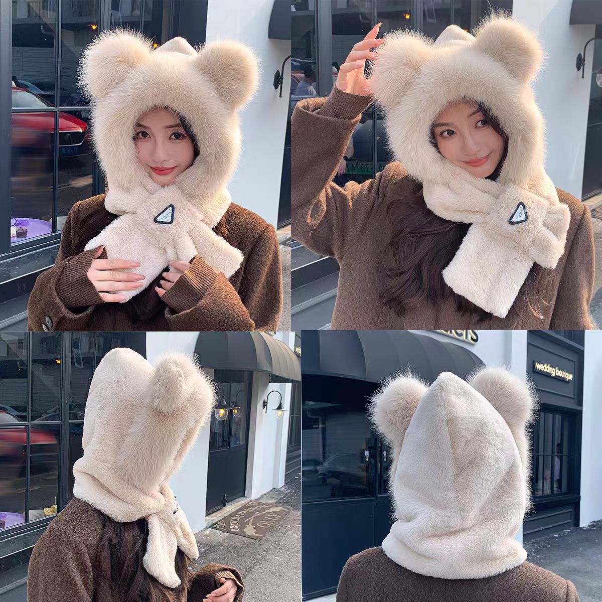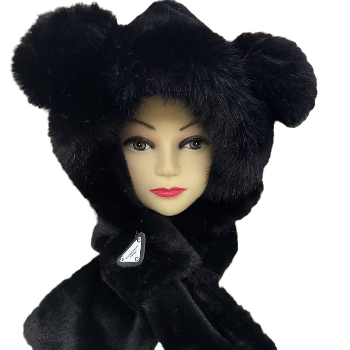 秋冬仿狐狸毛帽子可爱小熊连帽一体防寒护耳帽加厚保暖仿皮草帽子