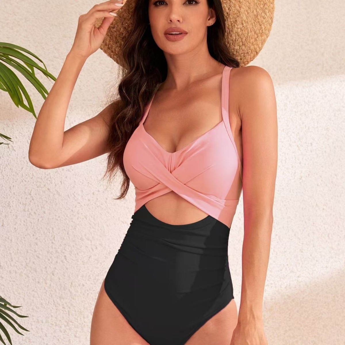 外贸跨境纯色连体泳衣女性感镂空葫芦岛泳装遮肉显瘦亚马逊泳衣