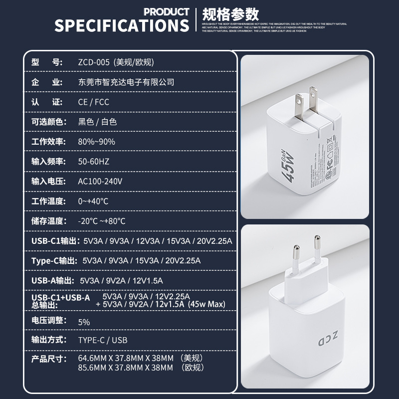 定制PD45W氮化镓充电器 手机电脑平板充电头 美规欧规电源适配器