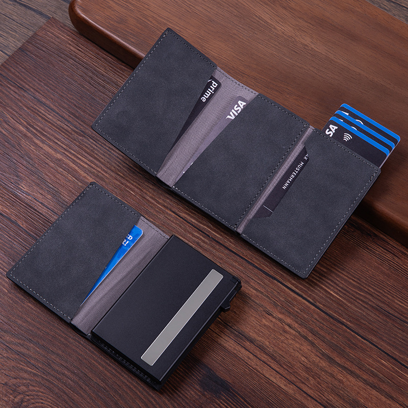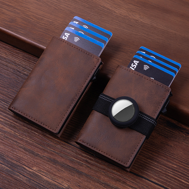 AirTag追踪器卡套时尚便携PU皮革多卡位男士铝合金RFID自动弹卡包