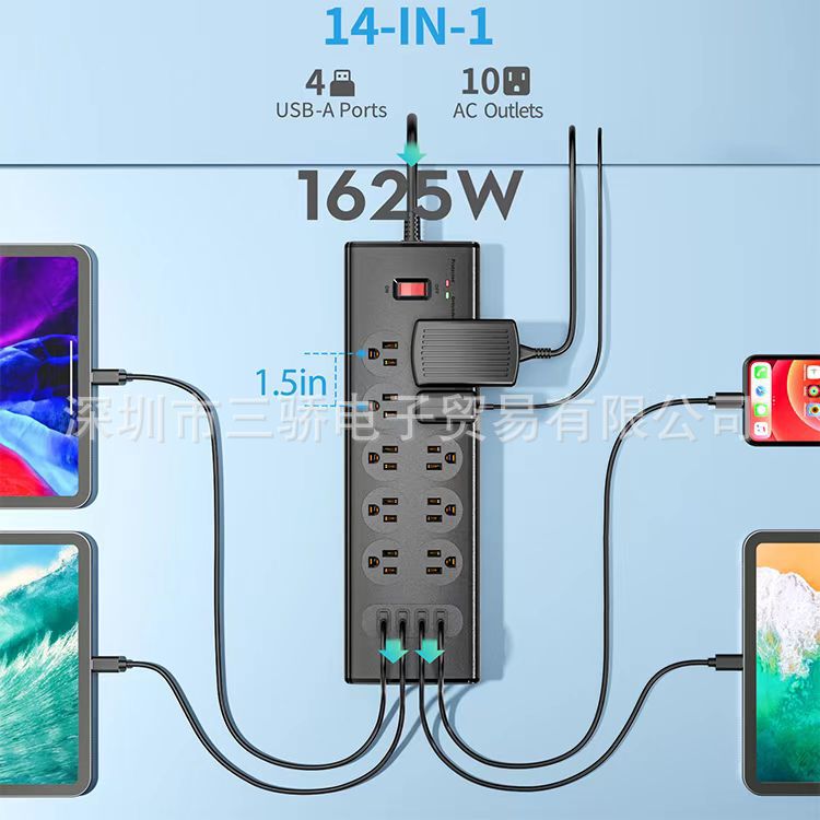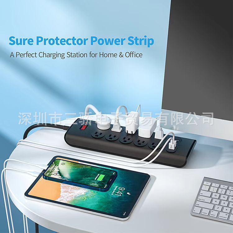 跨境美标排插13A五插位带导线16A拔掉断电排插带4个USB耐用美式