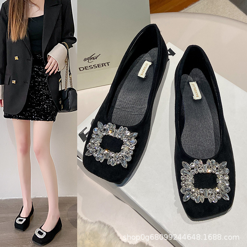 跨境新中式方头单鞋浅口低跟2025百搭新款水钻气质黑色软底女鞋工