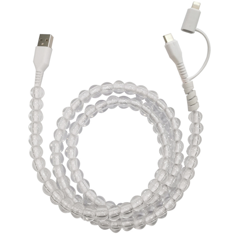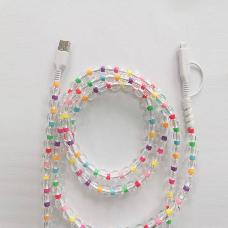 手工串珠二合一透明珍珠数据线 一拖二彩珠礼品充电线珠子定制1米