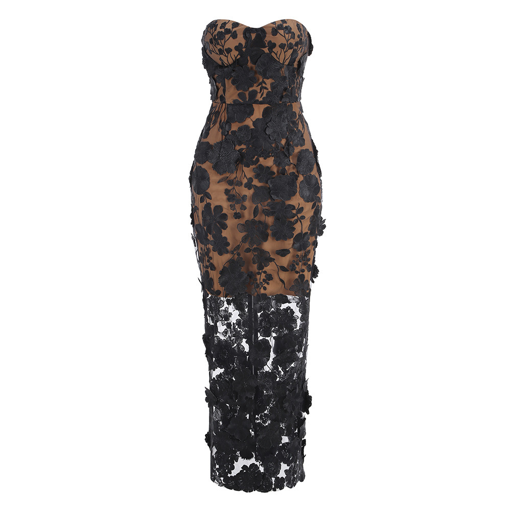 新品跨境夜店度假摄影连衣裙抹胸网纱刺绣花朵宴会派对走秀晚礼服