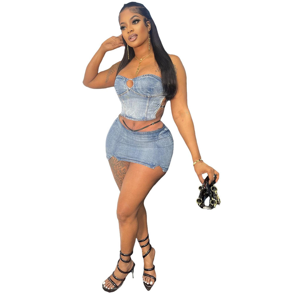 欧美女式牛仔裙套装亚马逊跨境女装性感抹胸牛仔上衣开衩迷你短裙