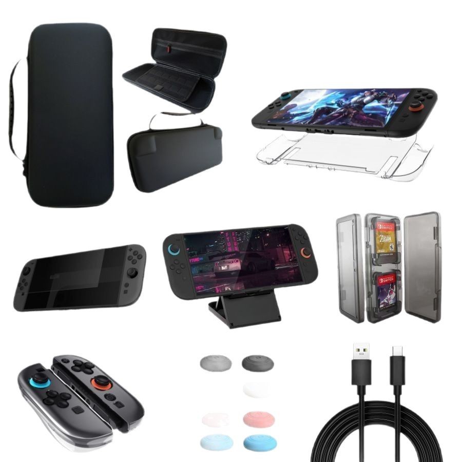 | 型号 | 两角包+分体保护壳+摇杆帽+钢化膜+数据线+四卡盒+tpu手柄+小支架 | 型号 | 两角包+透黑卡盒+保护壳+摇杆帽8个+小支架+钢化膜 |
