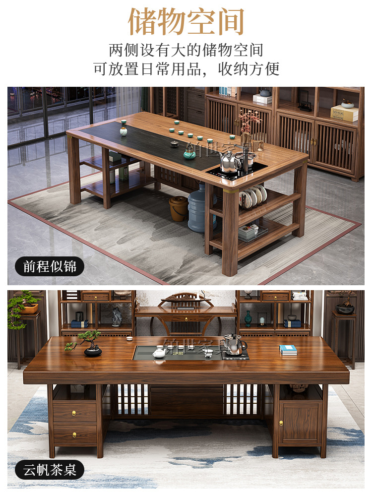 颜色 | 2.2米云帆茶桌+富贵椅1+围椅4 石茶盘/抽屉储物款 | | 颜色 | 2.2米云帆茶桌+富贵椅1+围椅4+茶水柜1 干泡桌/抽屉储物款 |