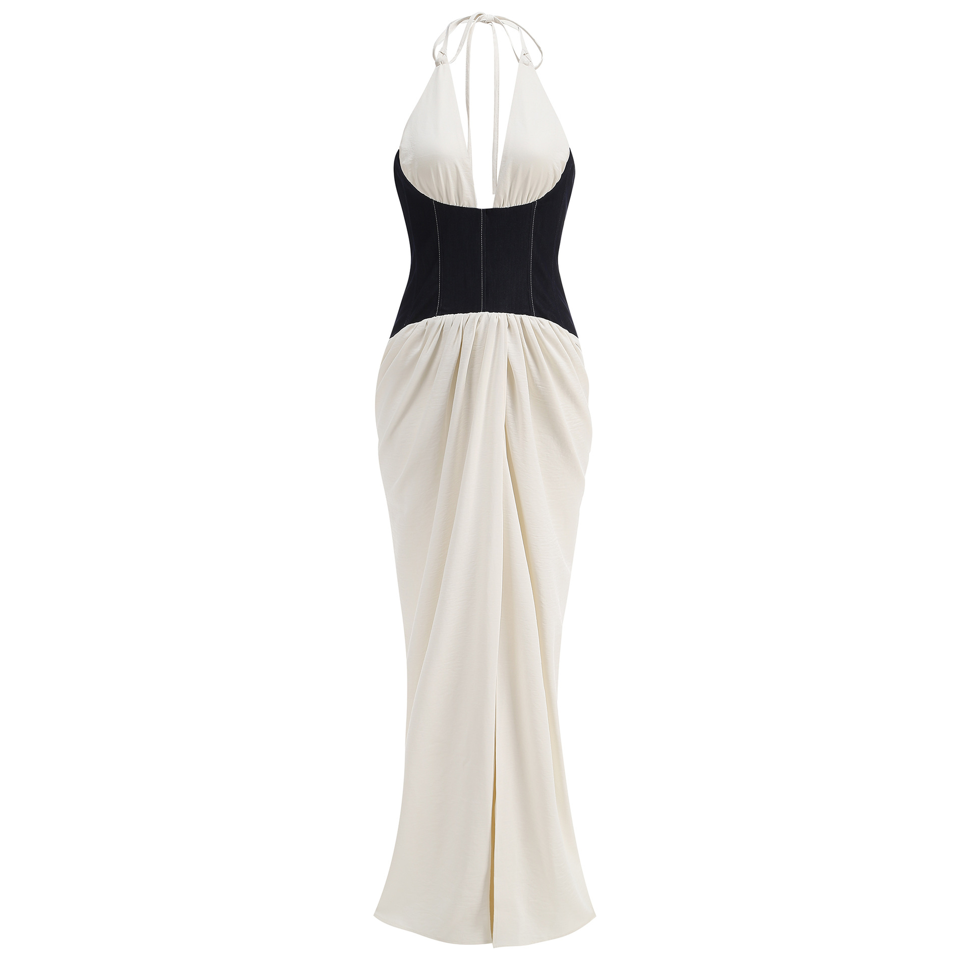 新品亚马逊跨境个性摄影宴会时装秀礼服撞色高开叉挂脖露背连衣裙