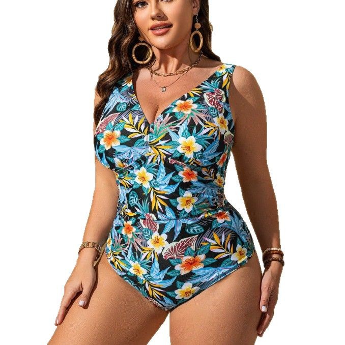 2025新款欧美跨境bikini碎花宽肩带大码泳装性感连体泳衣女