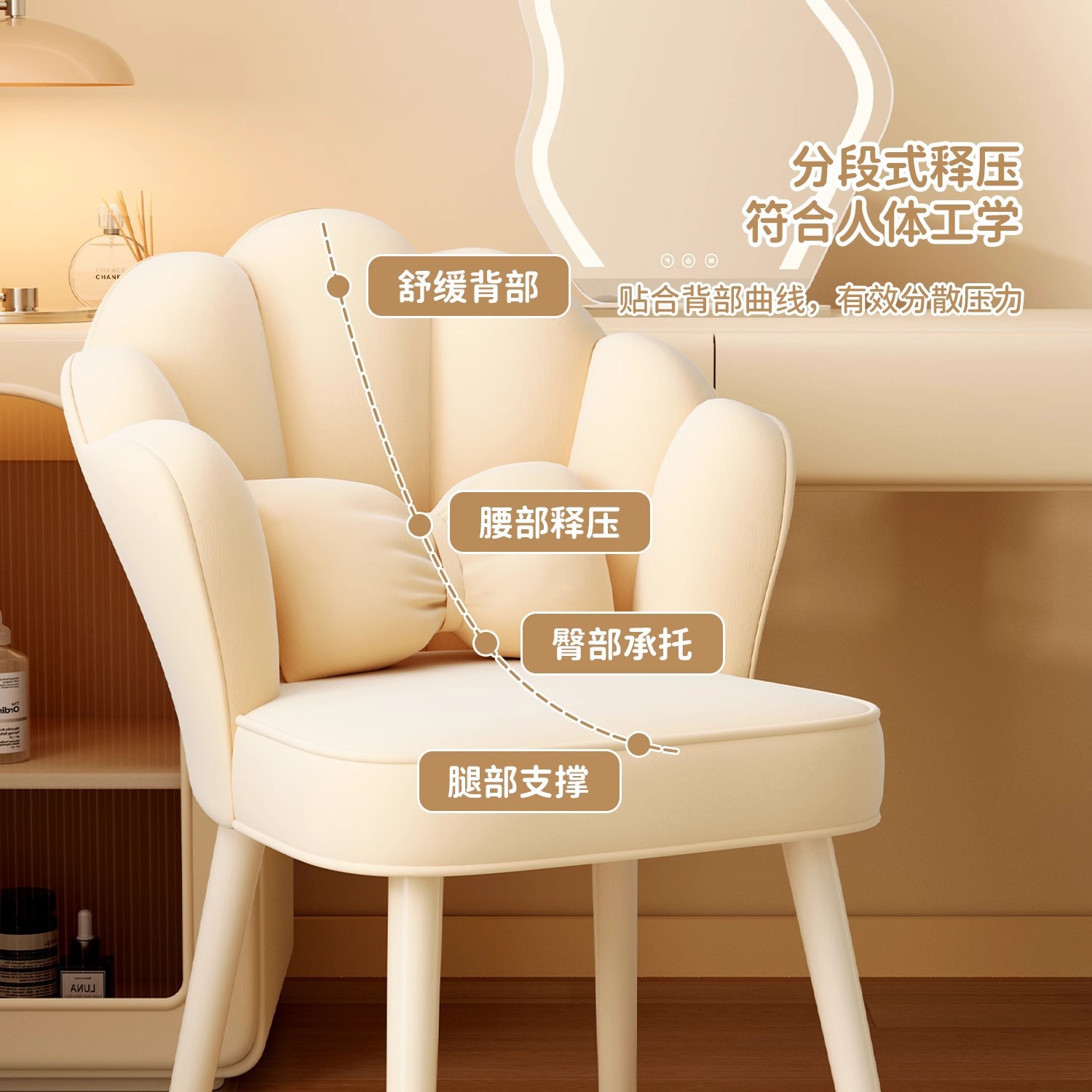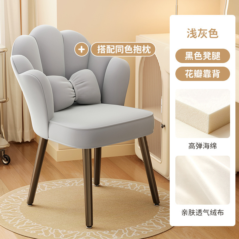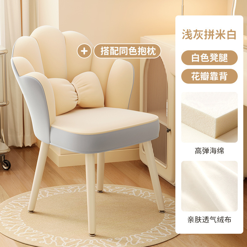 颜色 | 浅灰色+搭配同色抱枕-花瓣靠背-高弹海绵-白色凳腿 | | 颜色 | 浅粉色+搭配同色抱枕-花瓣靠背-高弹海绵-白色凳腿 |