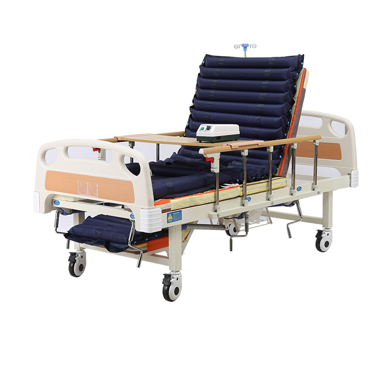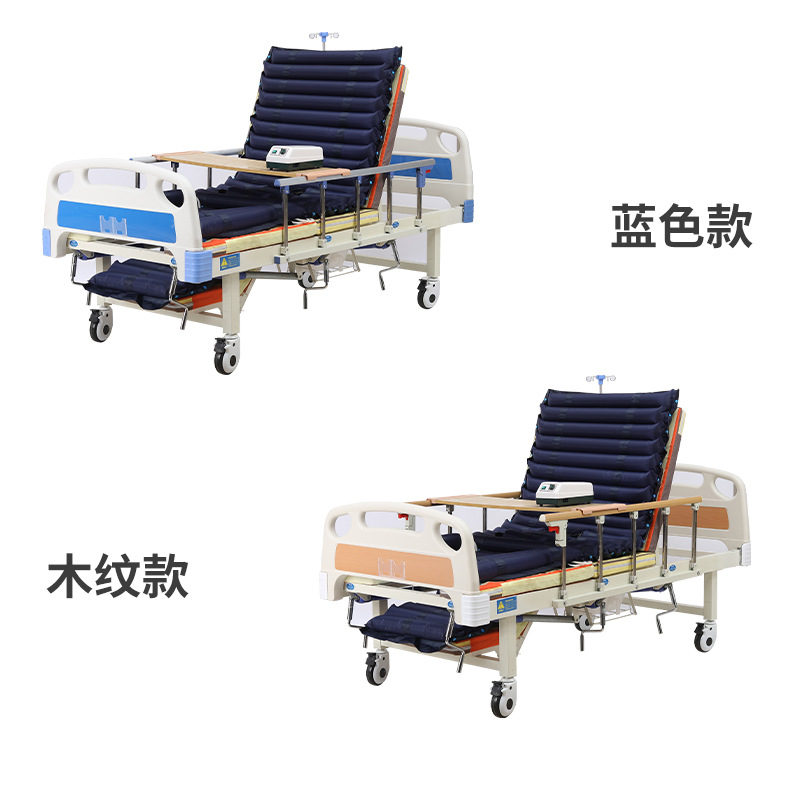 四摇中曲(床垫+护栏+滑轮+餐桌+便盆+输液架+气垫)木纹色