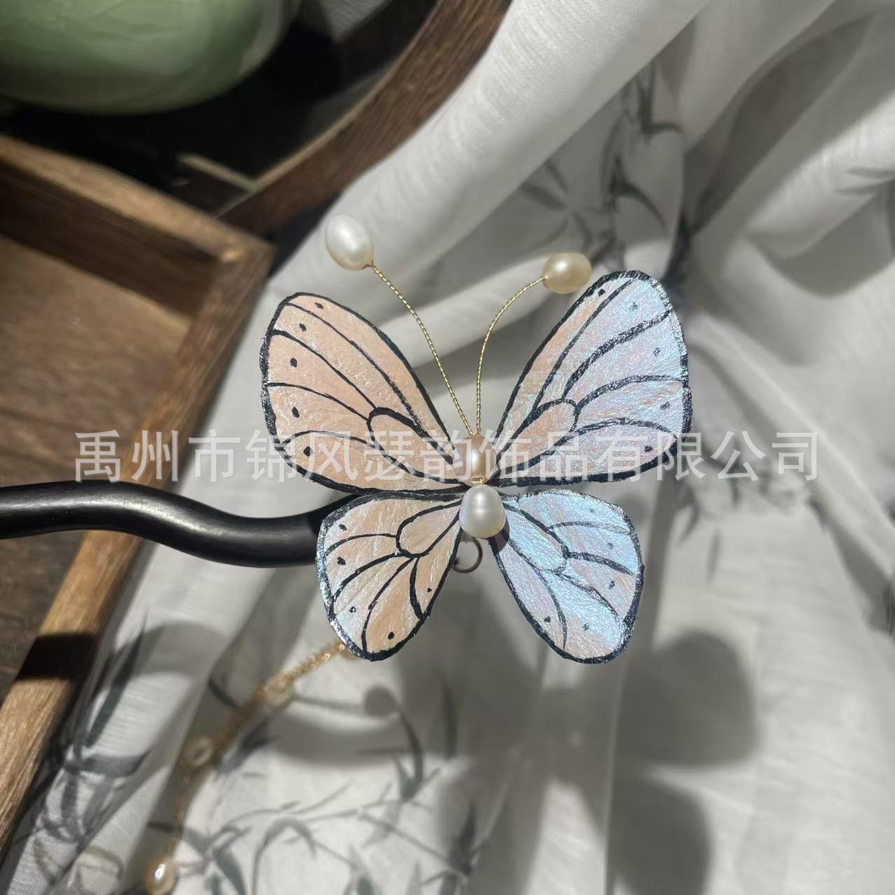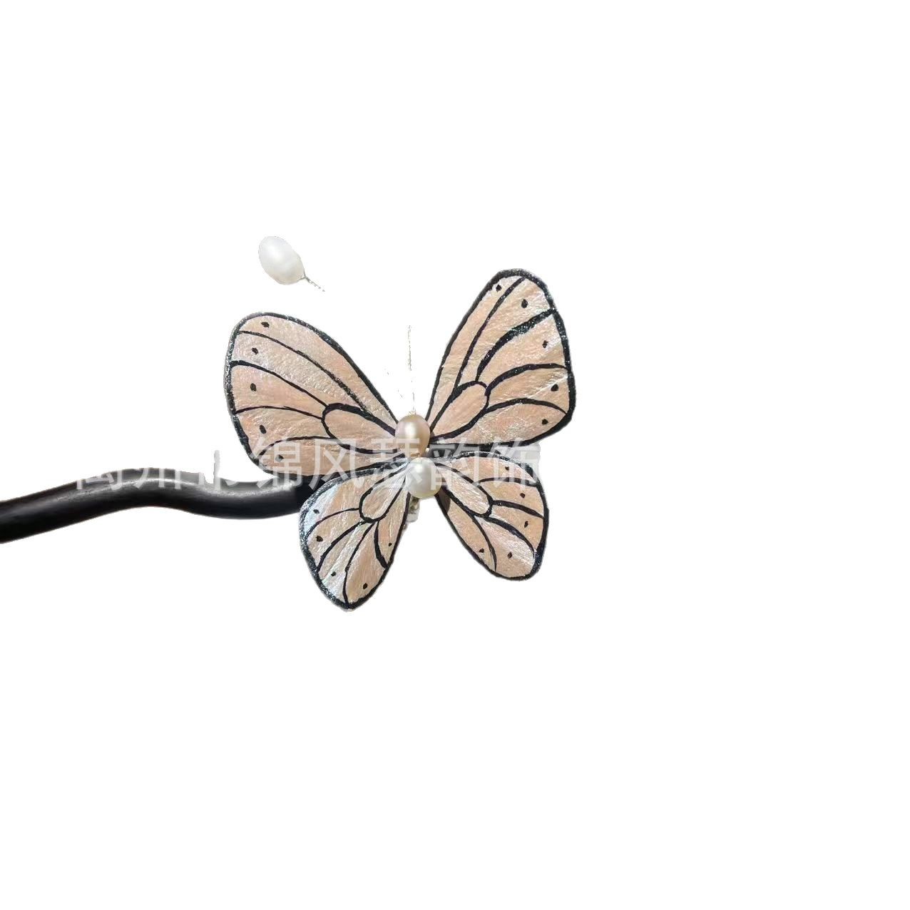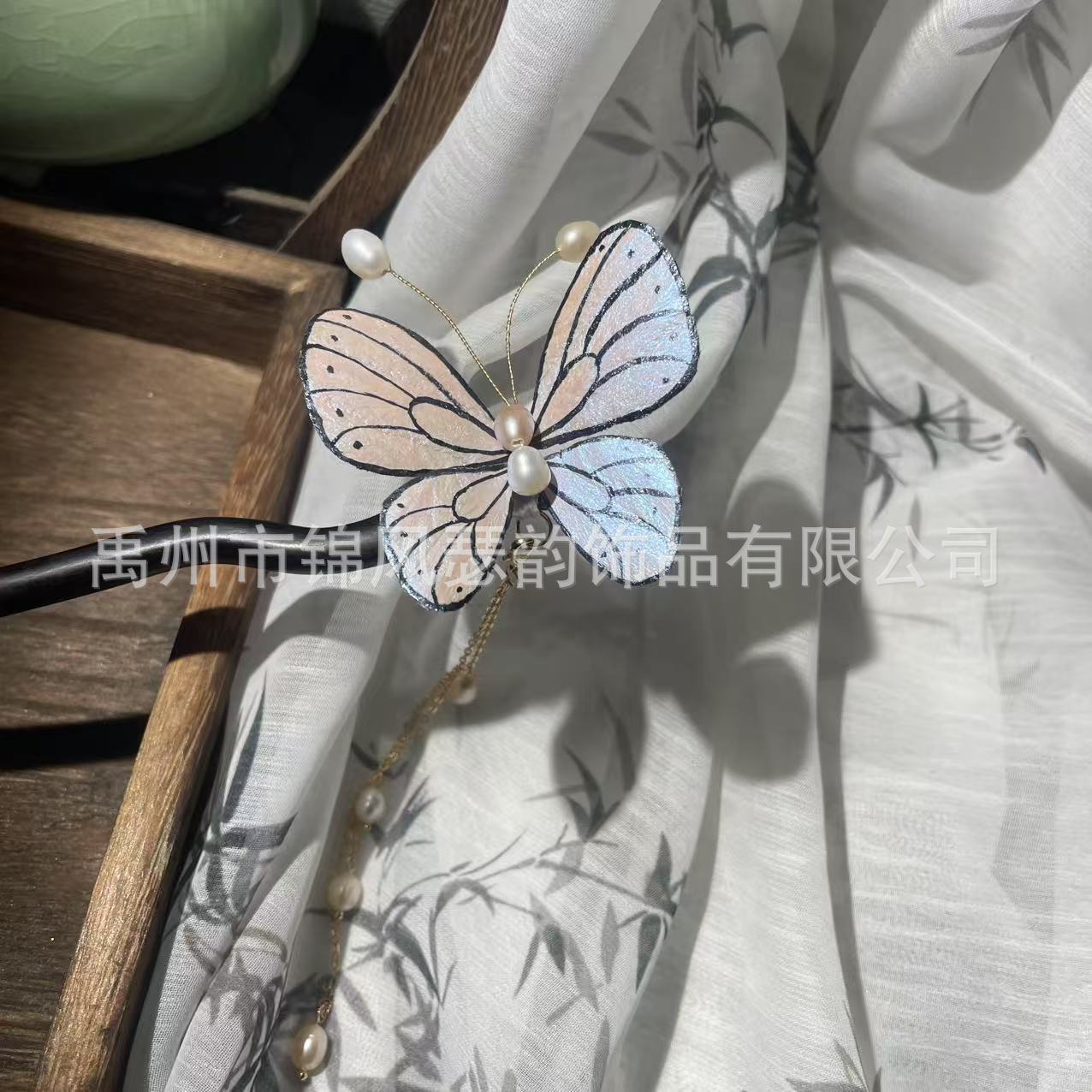 非遗绒花发簪颤枝蝴蝶闪蝶手工绒花发饰古风汉服配饰檀木簪子国风