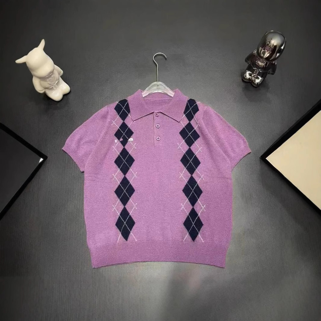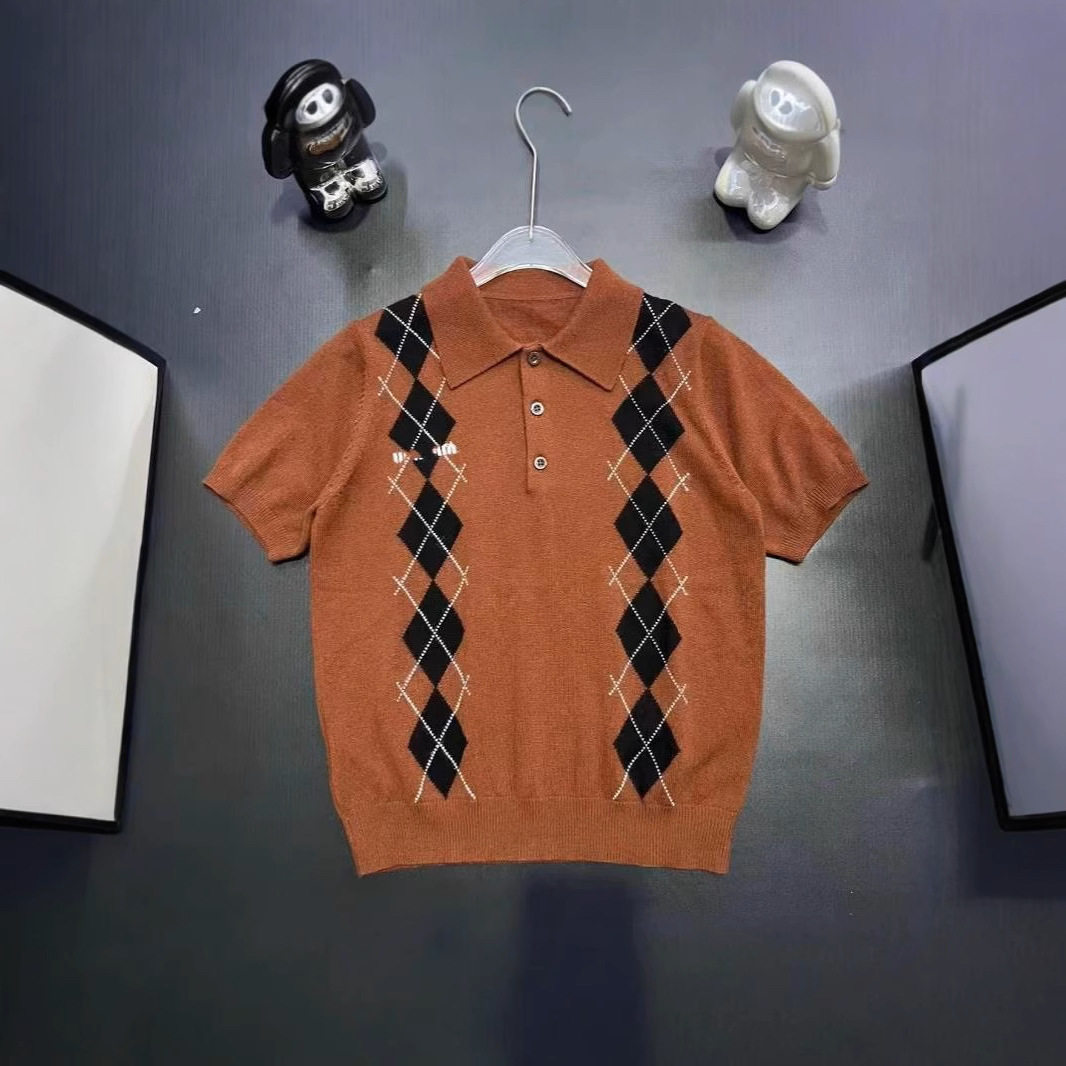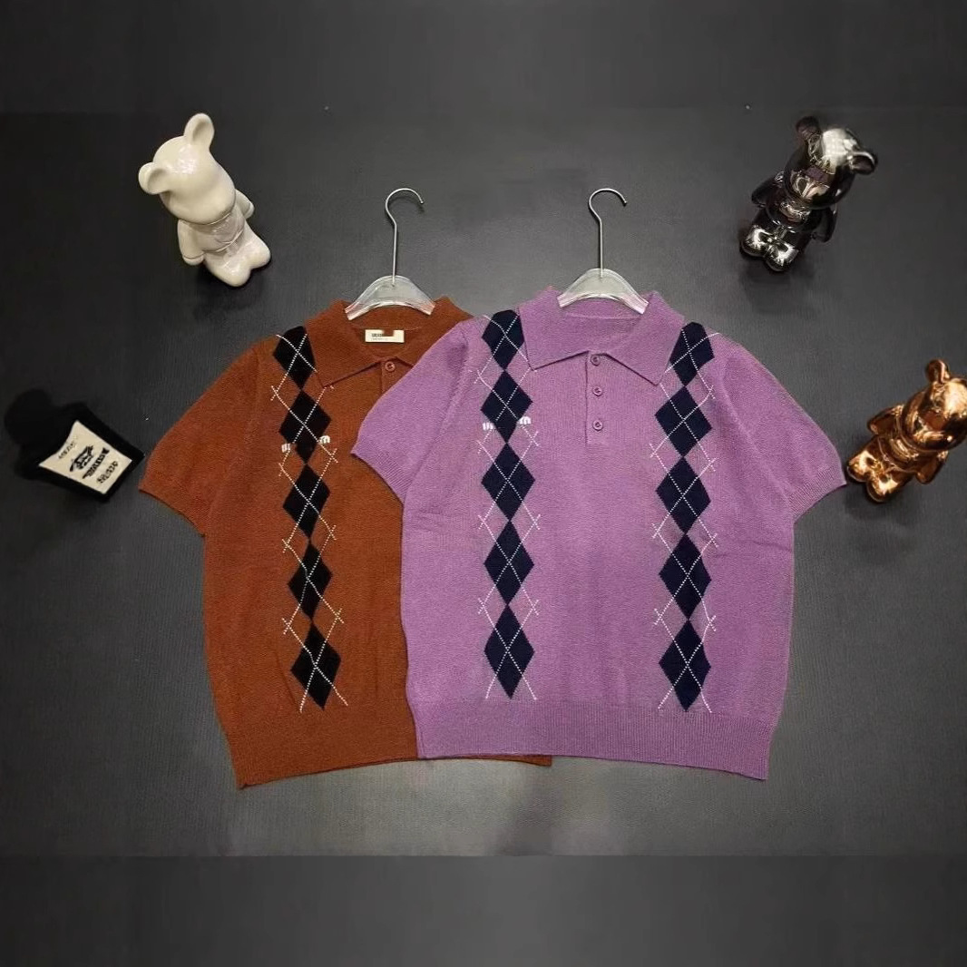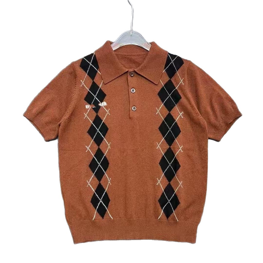 M家24年夏季新款撞色菱形格短袖修身显瘦针织衫短袖女t恤