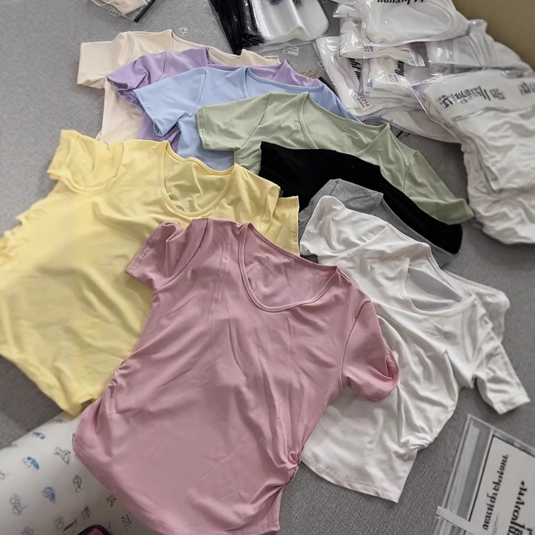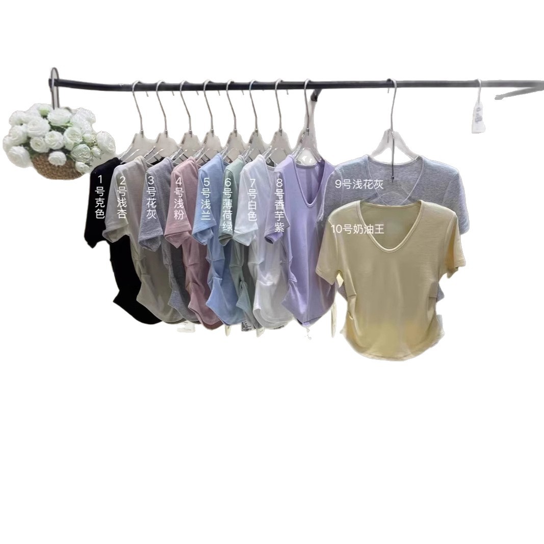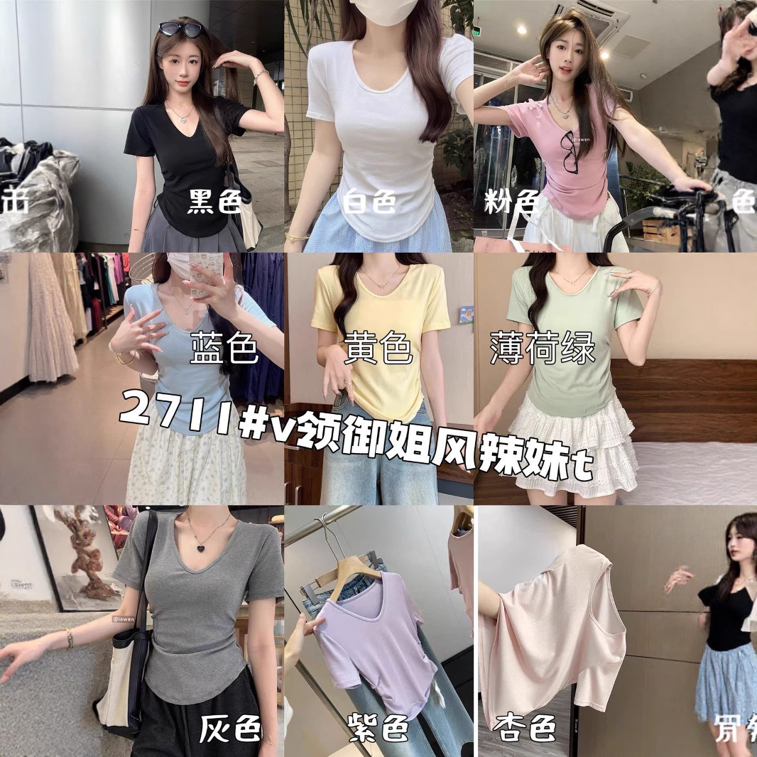 2025新款爆品夏季韩版v领简约糖果色褶皱设计感百搭短袖T恤上衣