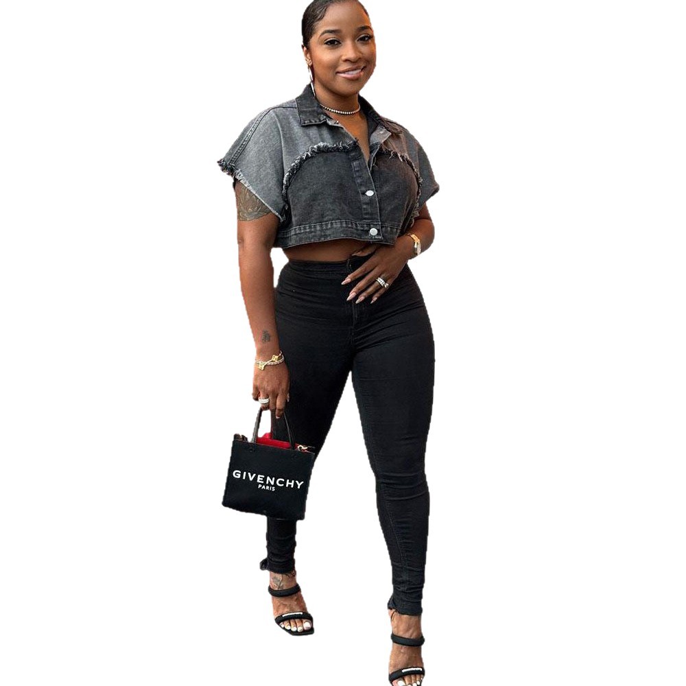 欧美女式短款牛仔外套 亚马逊跨境女装时尚休闲水洗拼色牛仔夹克