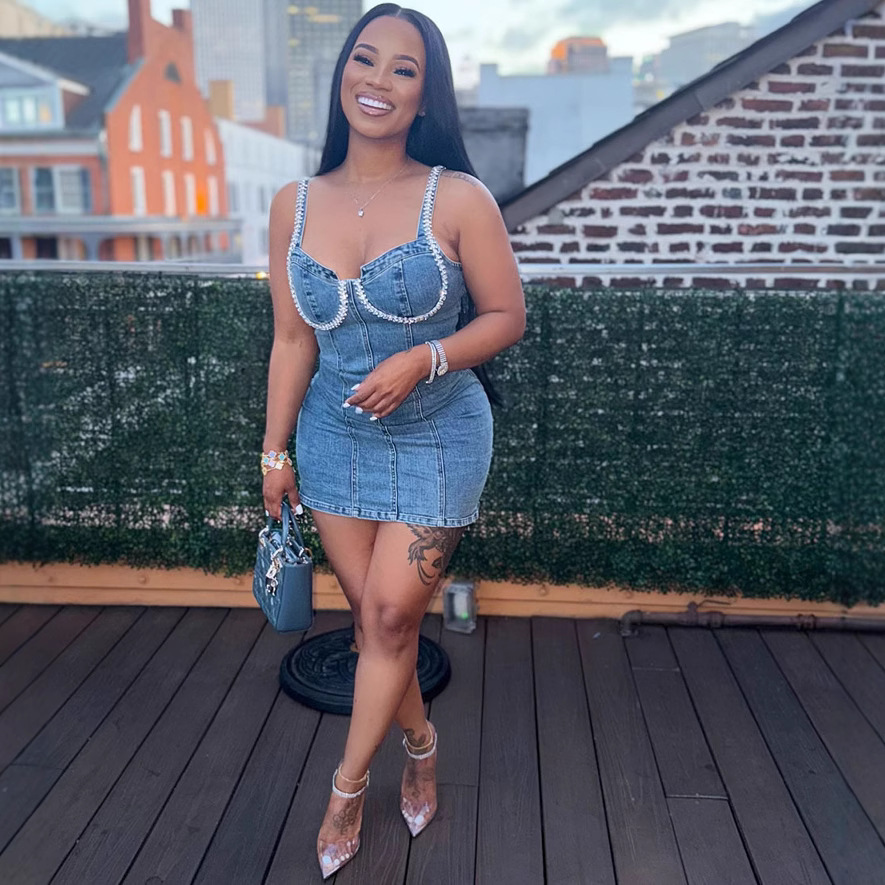欧美女式牛仔吊带裙亚马逊跨境女装夏季新款时尚性感亮钻连衣短裙
