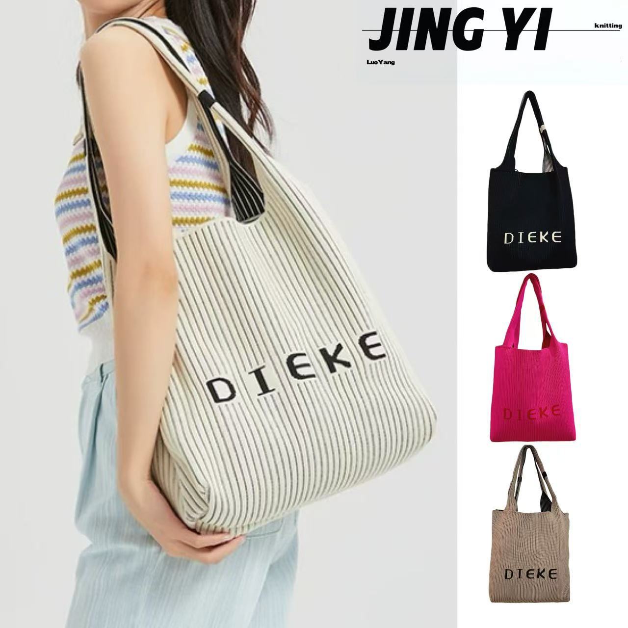 新款大容量针织包单肩包女挎包编织包流行百搭条纹女包字母托特包
