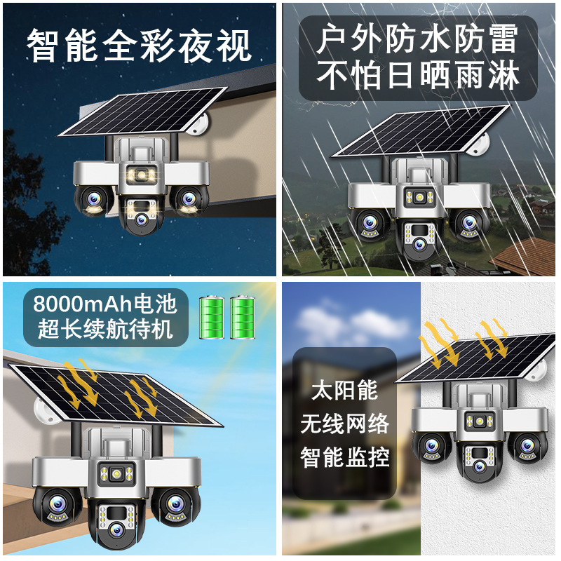 跨境爆款360度无死角监控三球一体机云台三画面太阳能监控摄像头