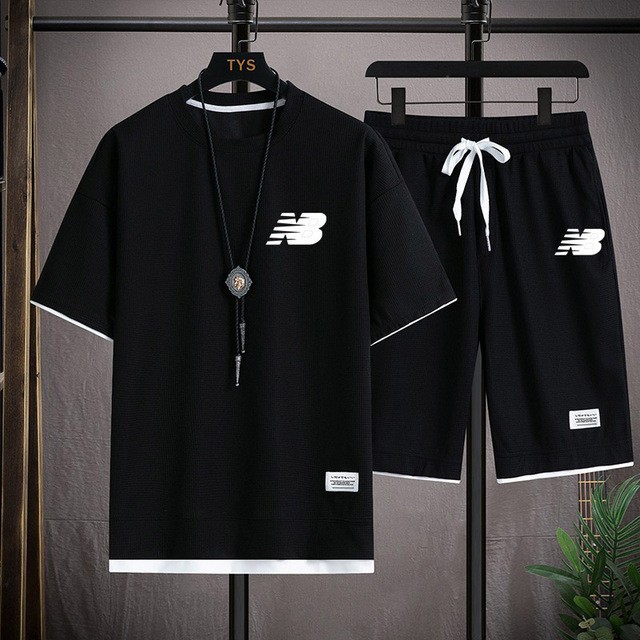 外贸休闲套装夏季新款华夫格宽松休闲两件套跨境运动套装男士短袖