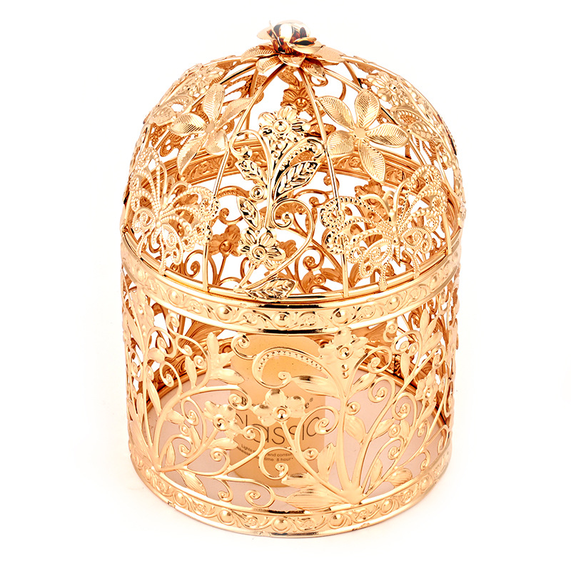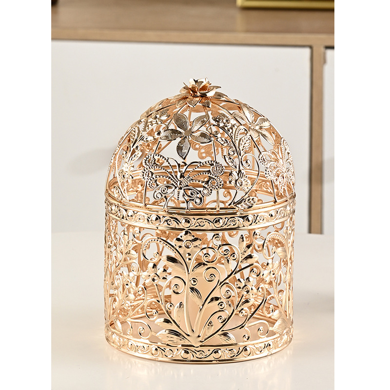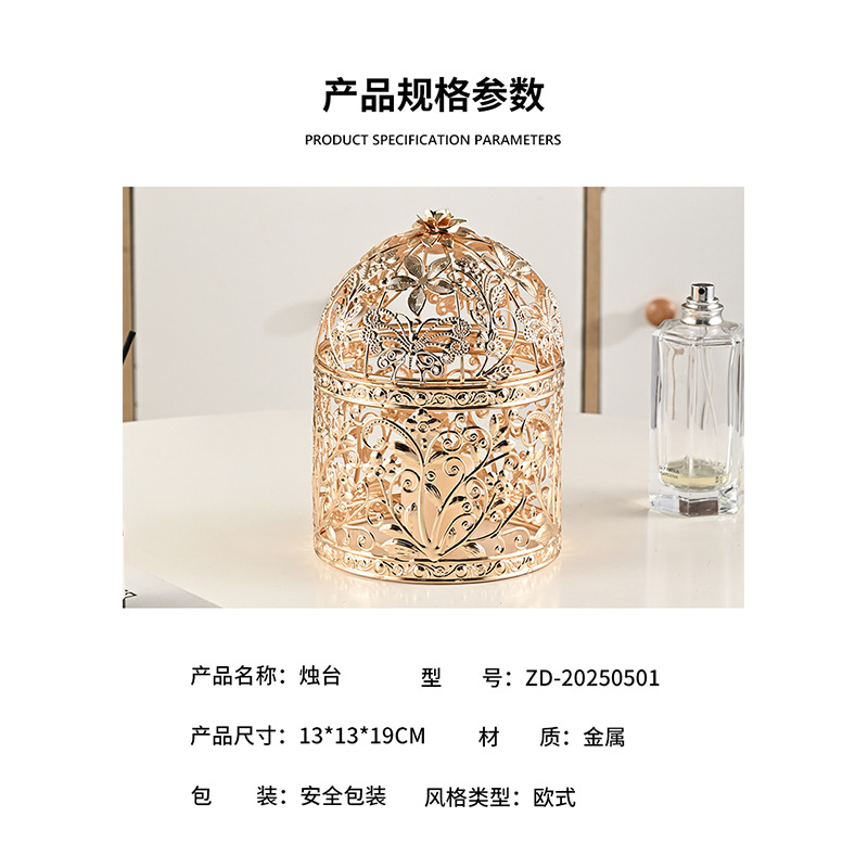 跨境轻奢金属烛台铁线工艺北欧镂空蜡烛台电镀金鸟笼家居创意摆件