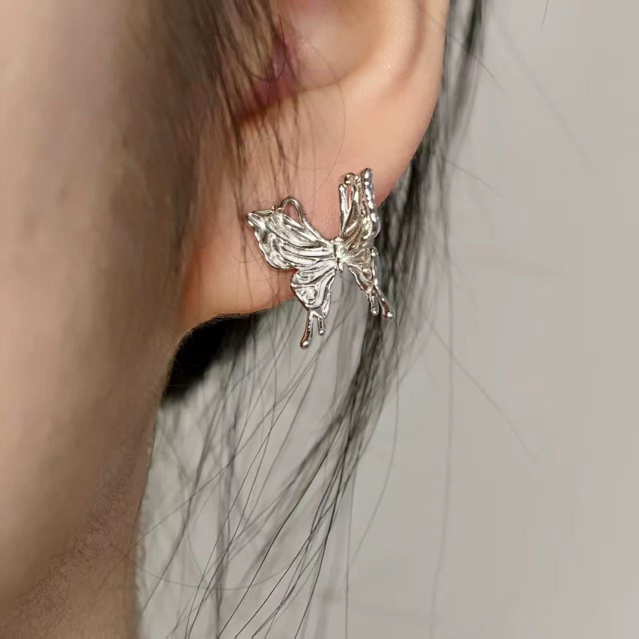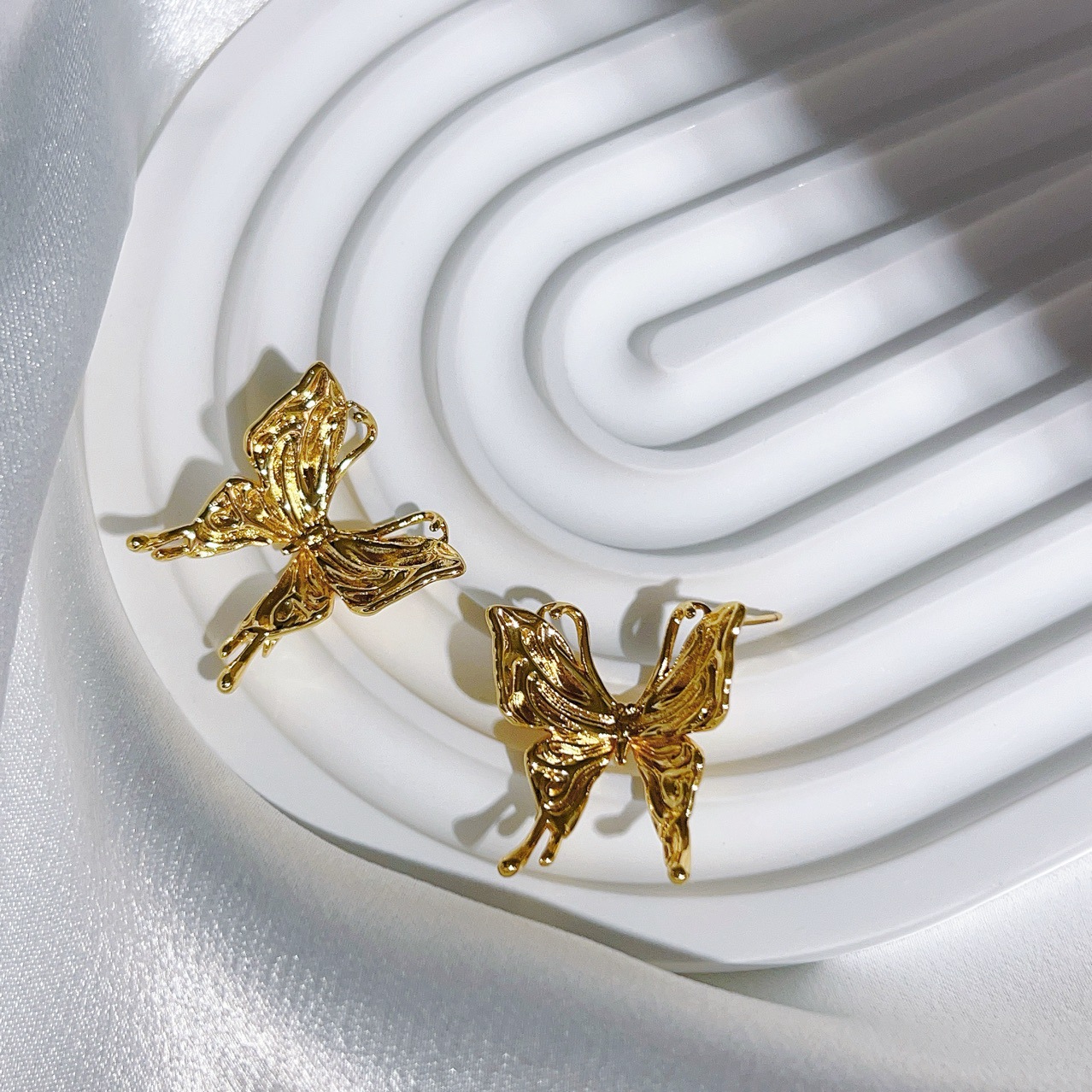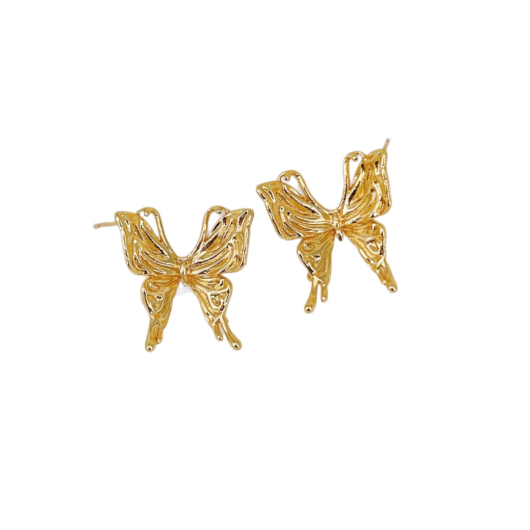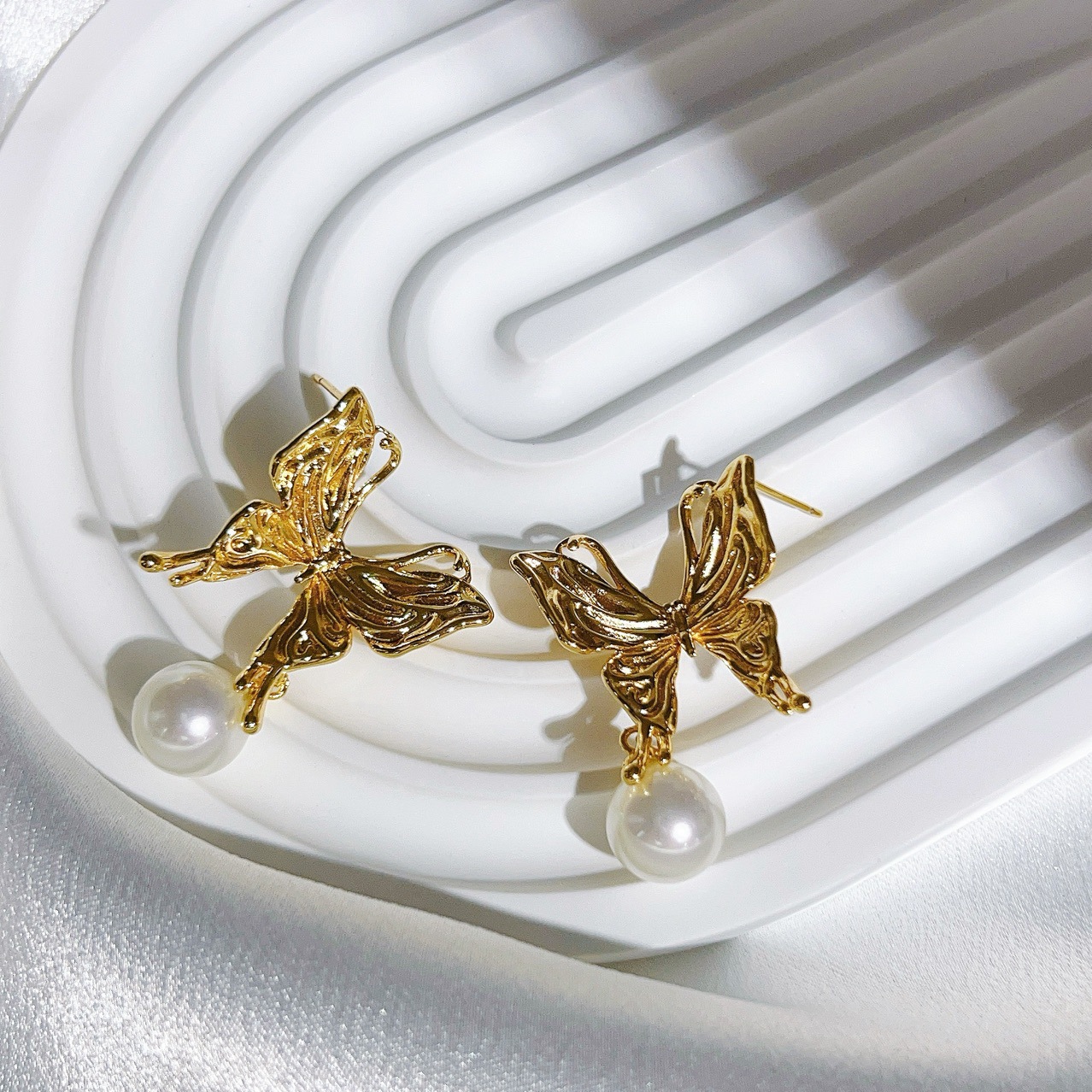 铜镀真金白金蝴蝶珍珠耳钉s925银针液体液态蝴蝶流苏DIY饰品耳饰