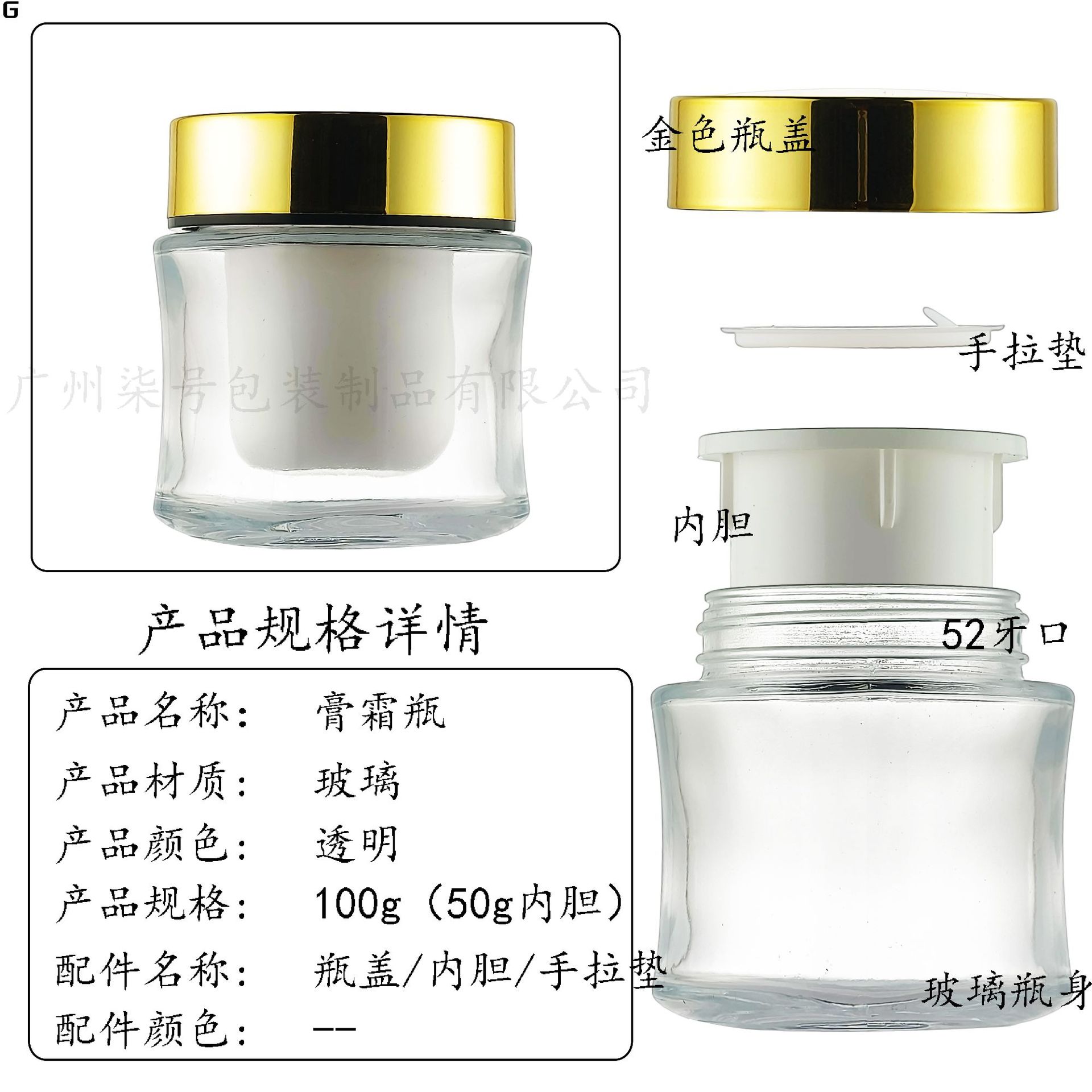| 规格型号 | 100g+30g内胆+垫片+盖子;透明;玻璃 | 专用包装 | 化妆品包装 |