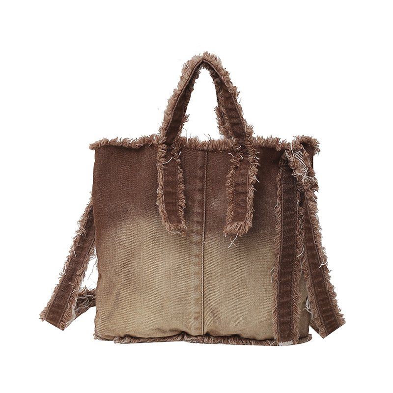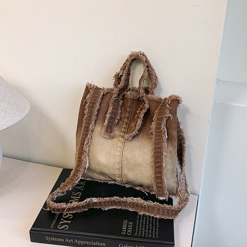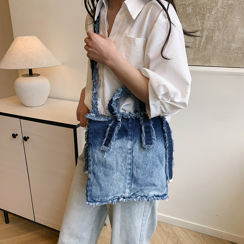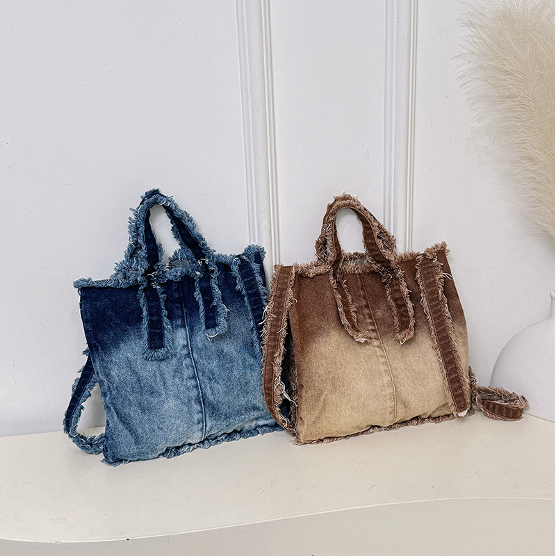牛仔布流苏包女简约时尚流浪风单肩斜挎包水洗帆布渐变辣妹托特包