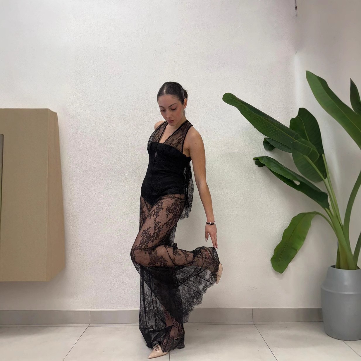 跨境新品欧美风女装派对透明蕾丝晚礼服 时尚挂脖性感气质连体裤