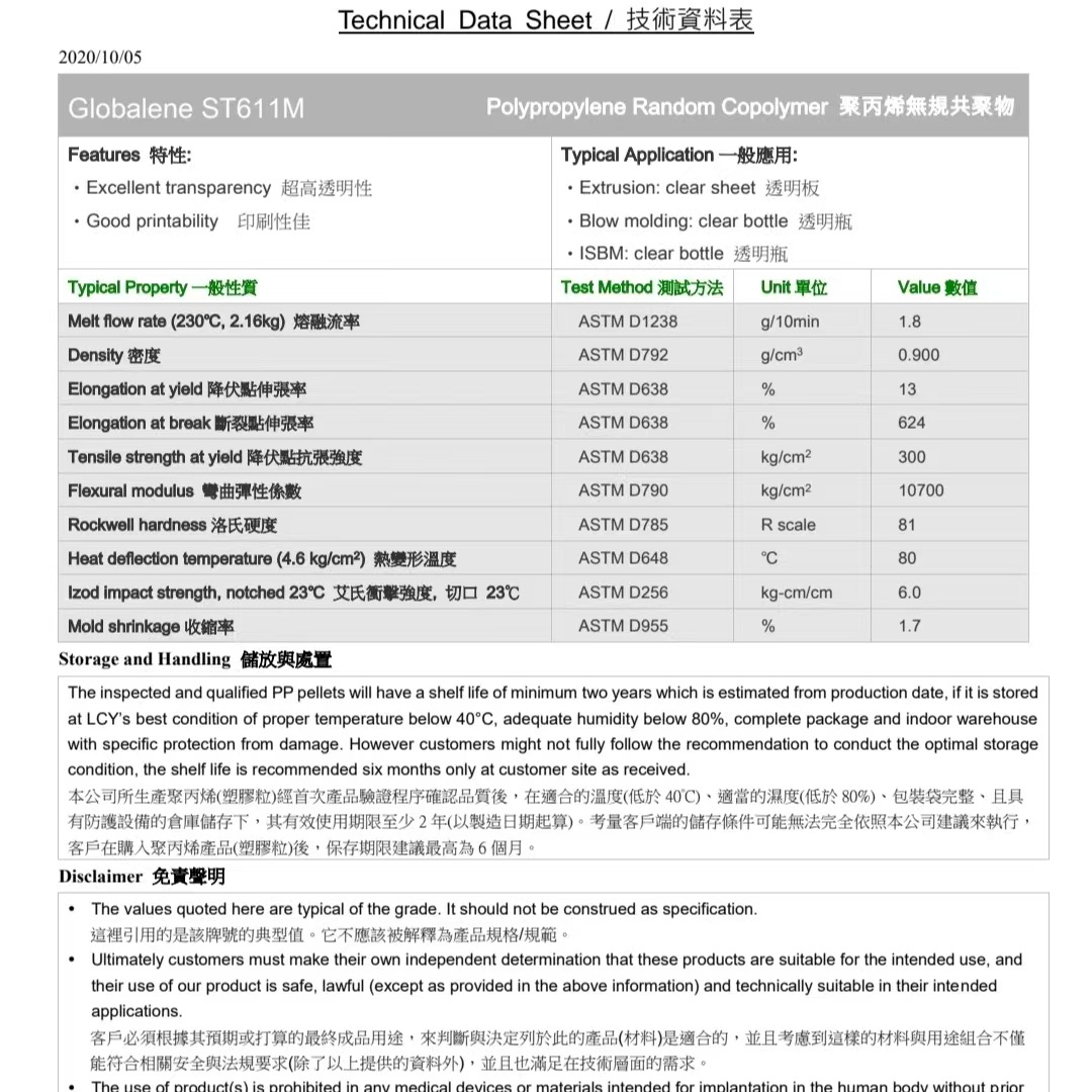 原产国/地区PP 台湾李长荣(福聚) ST611M 透明级