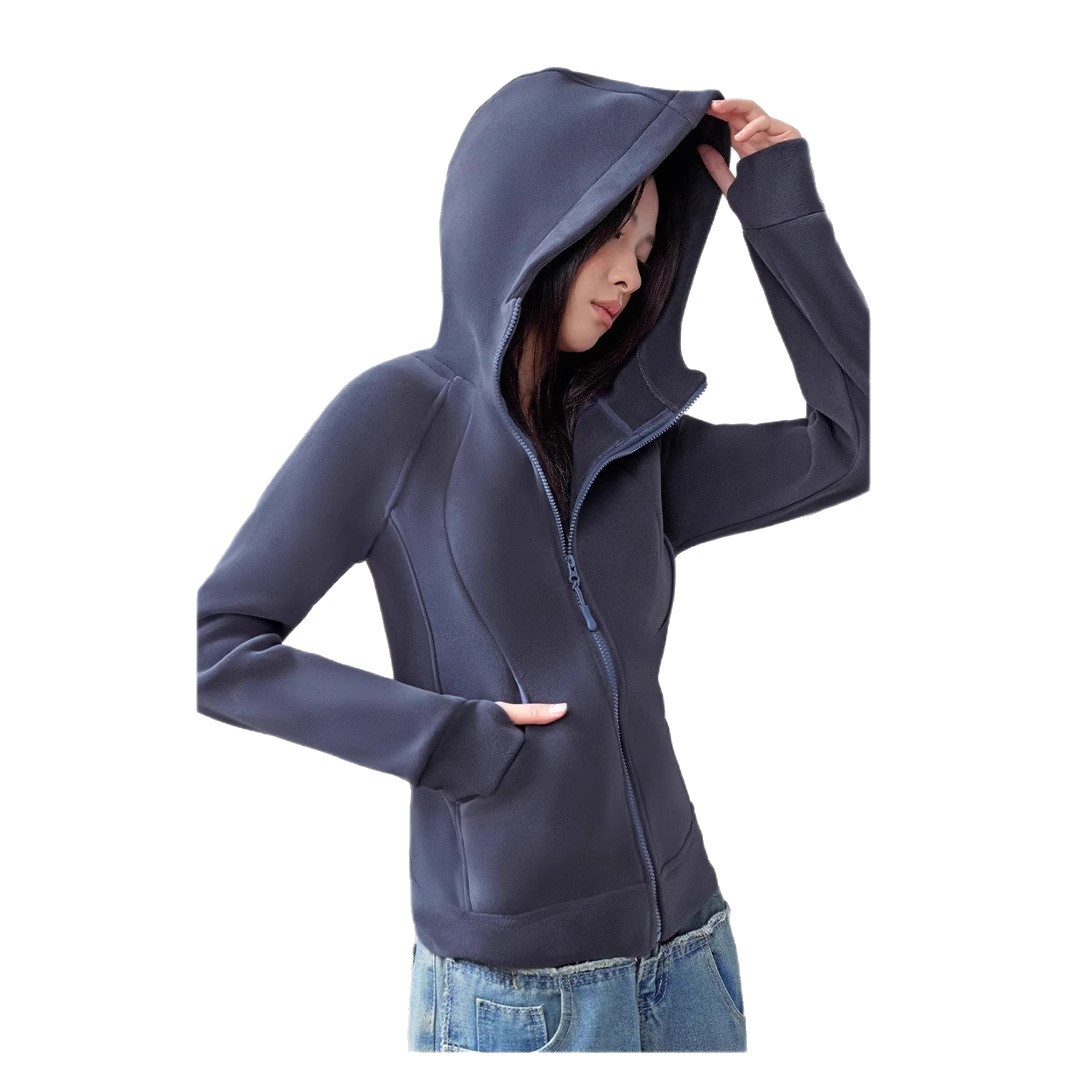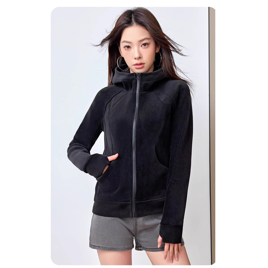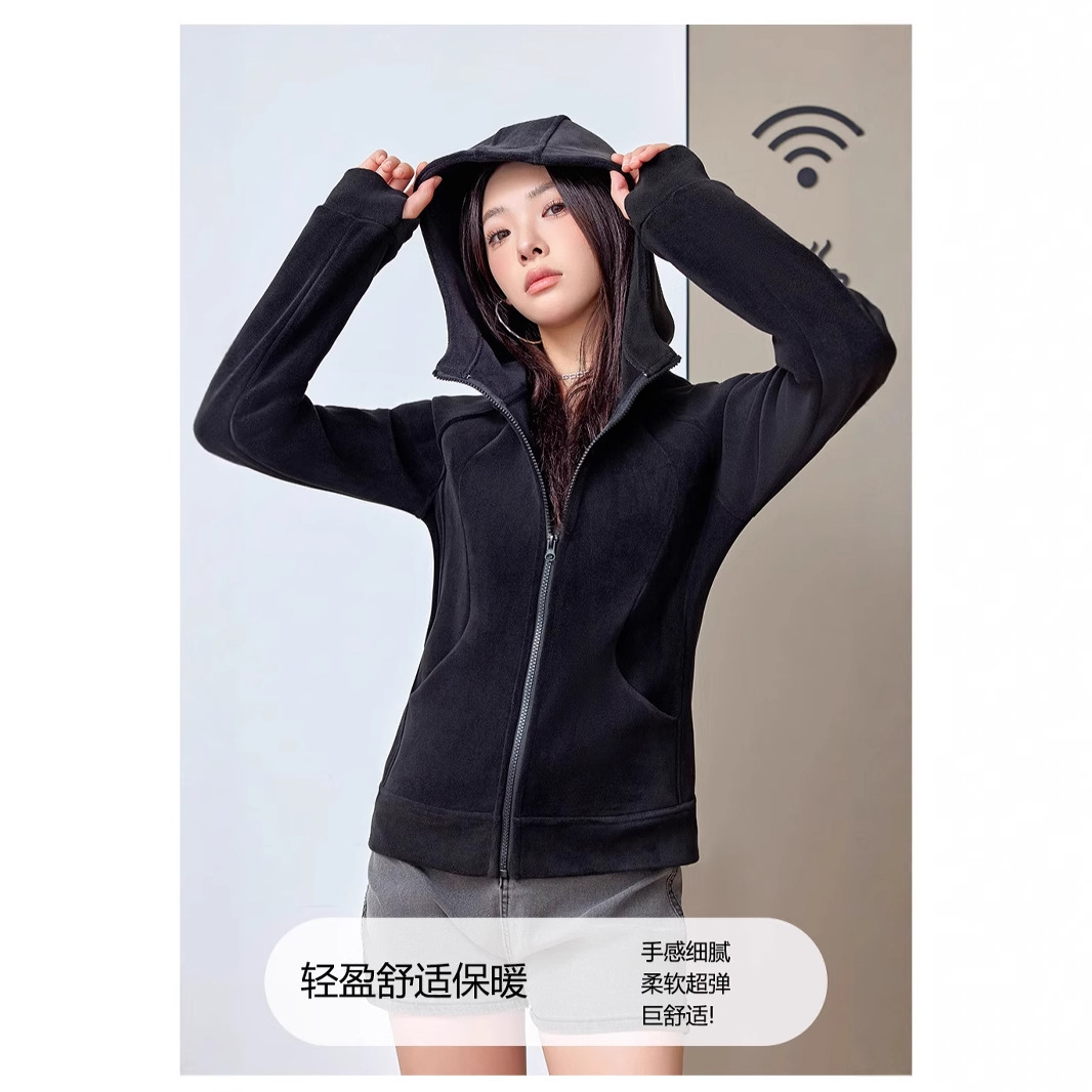 户外舒适之选连帽卫衣女防风抗静电双面奥利绒收腰拉链开衫外套。