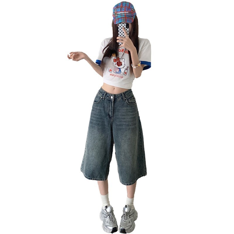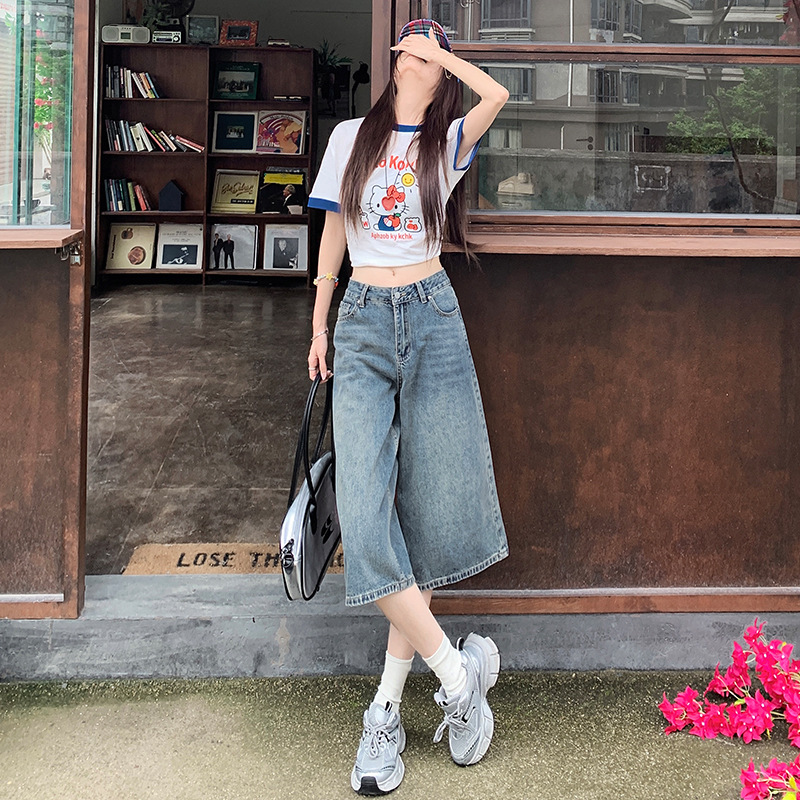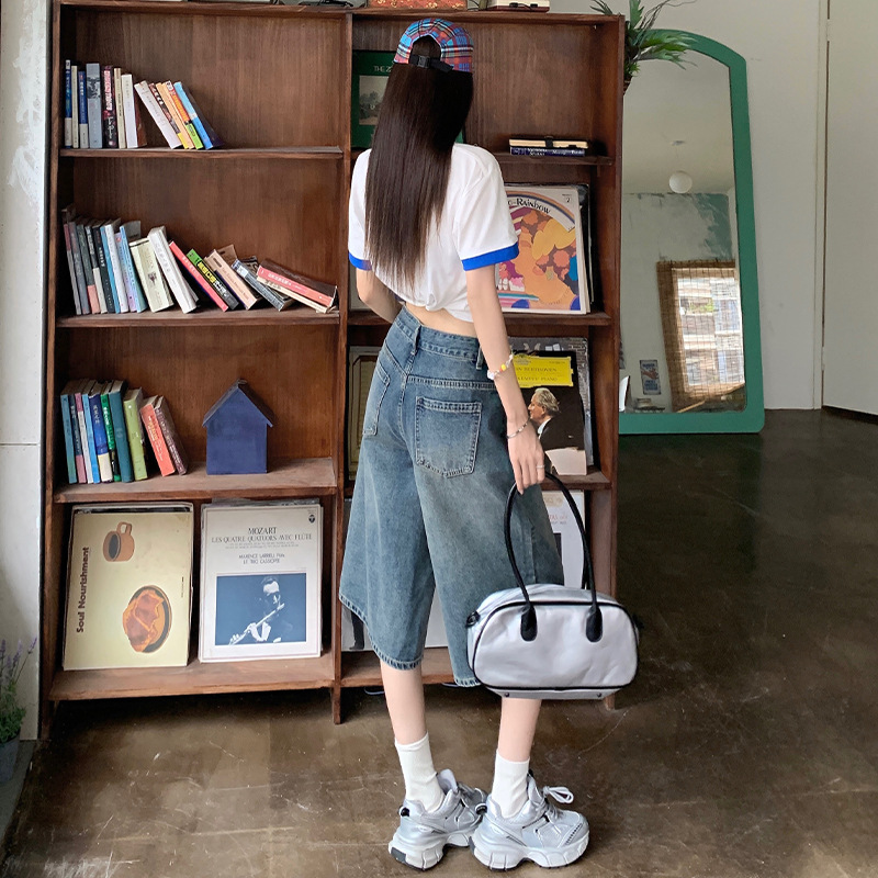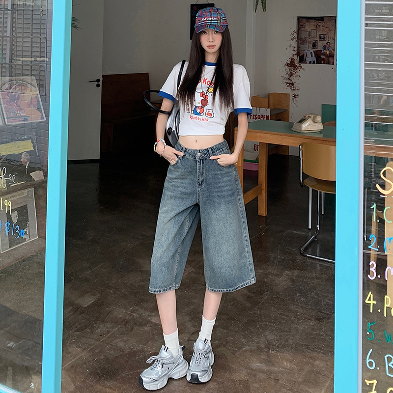 复古蓝色高腰牛仔裤女夏季小个子七分裤显瘦百搭直筒长裤阔腿裤子