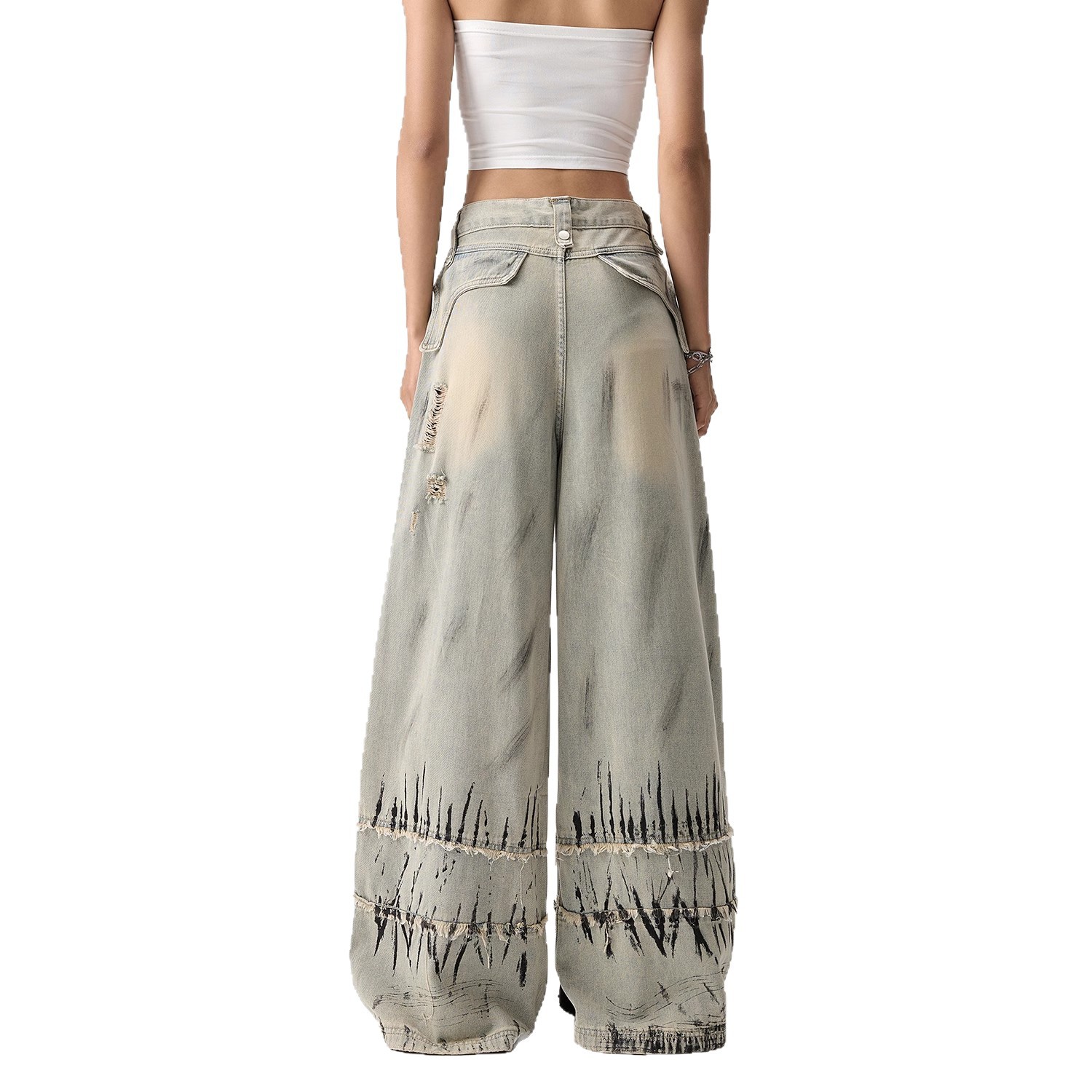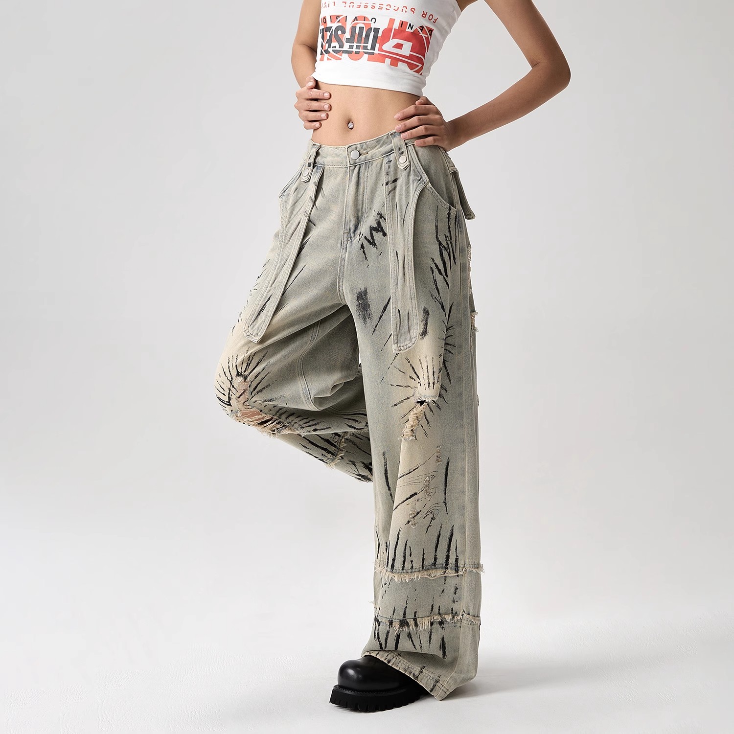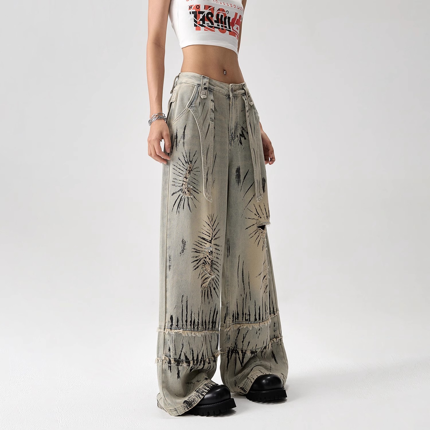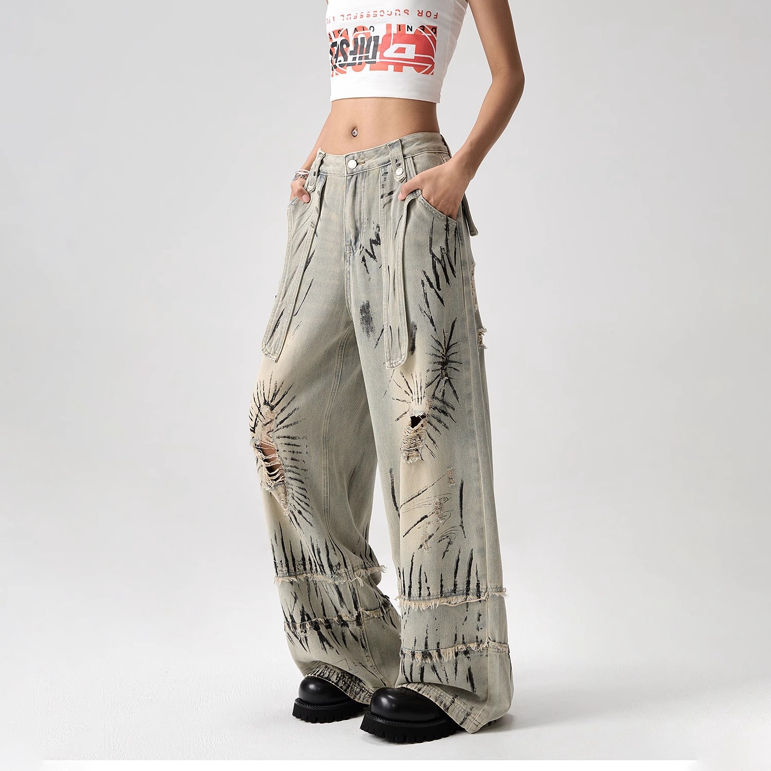 2025夏新款潮牌时尚美式高街复古破洞阔腿牛仔裤女宽松直筒垂感裤