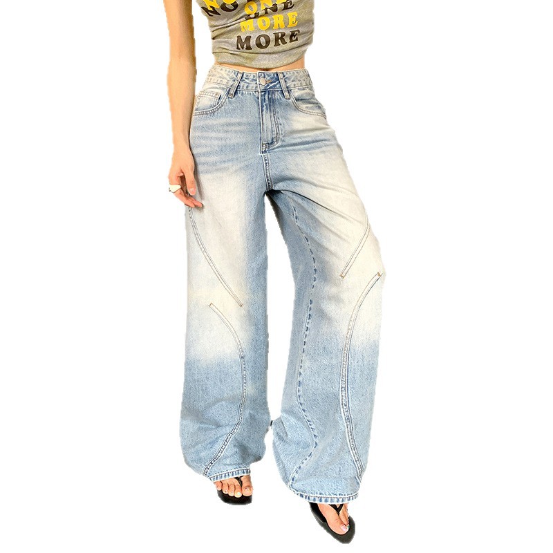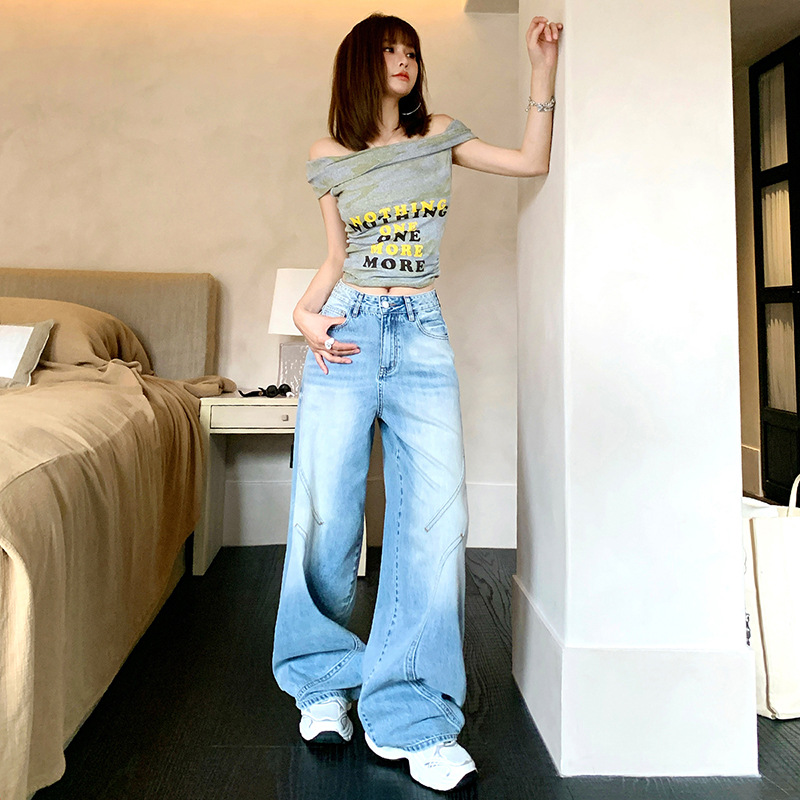 浅蓝色阔腿低腰牛仔裤女夏新款美式辣妹宽松显瘦百搭直筒拖地裤子