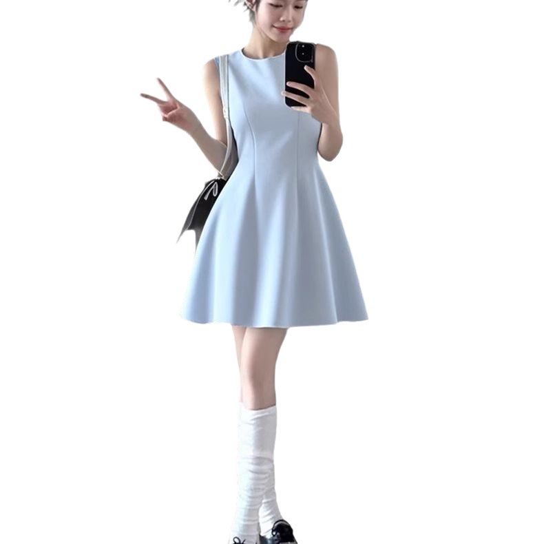 蓝色无袖连衣裙女夏日绝美漂亮小裙子多巴胺a字收腰掐腰短裙穿搭