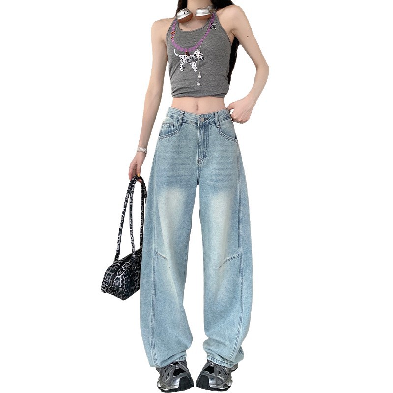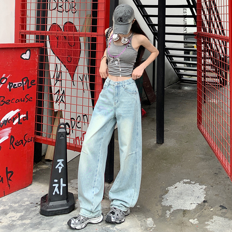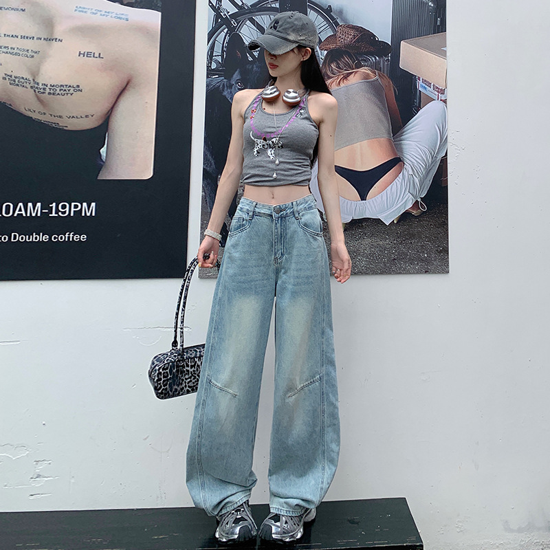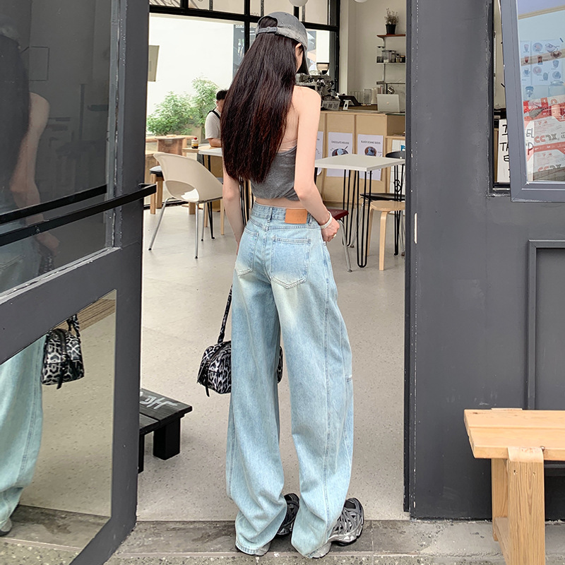 复古怀旧拼接垂坠感牛仔裤夏季新款高腰显瘦宽松百搭窄版直筒裤女