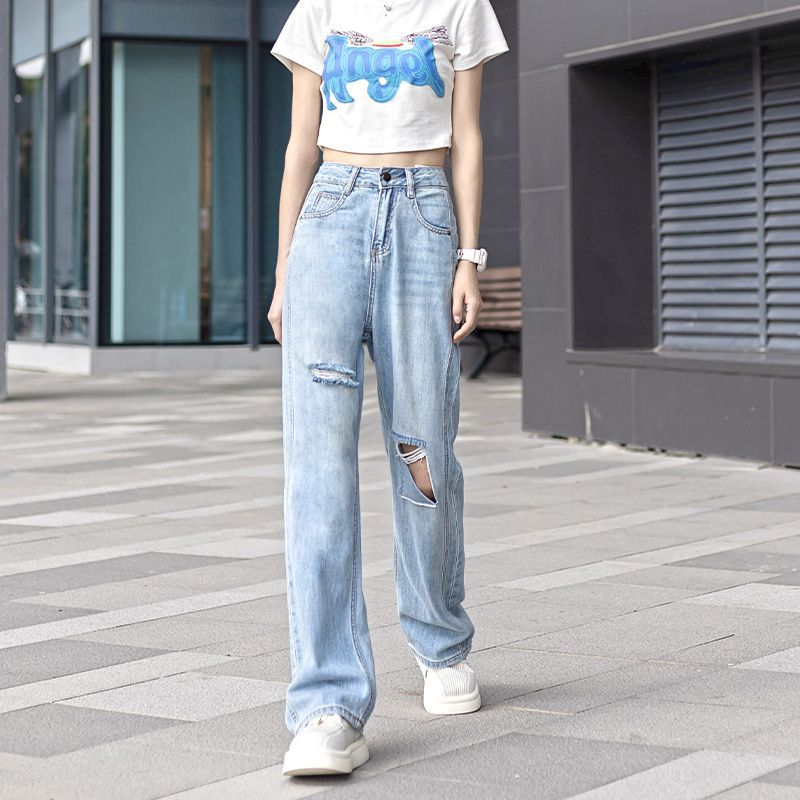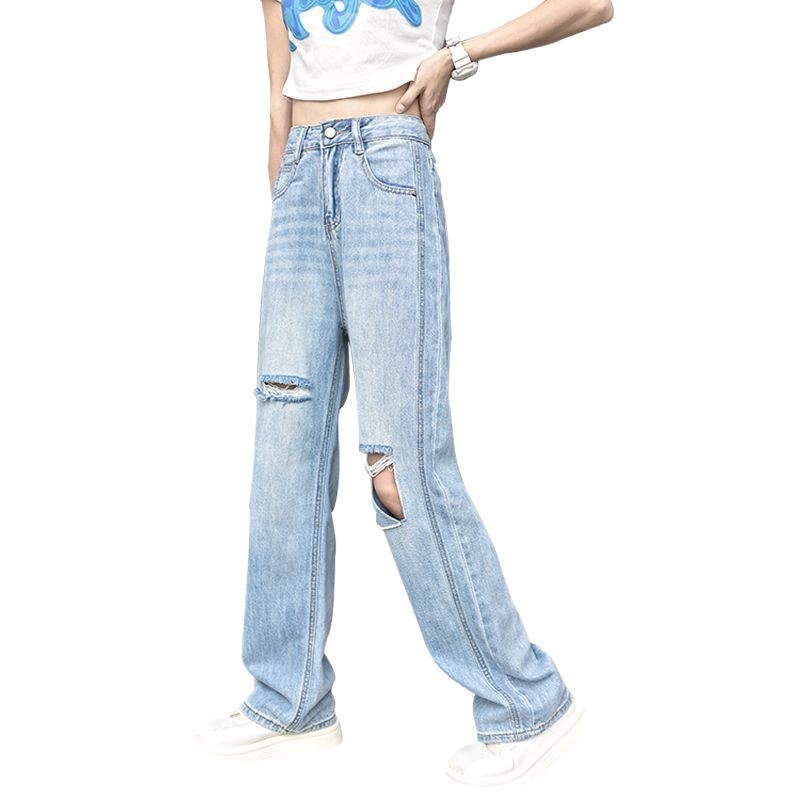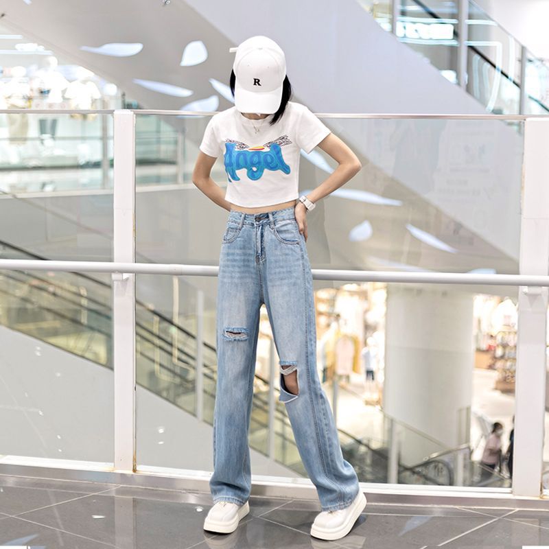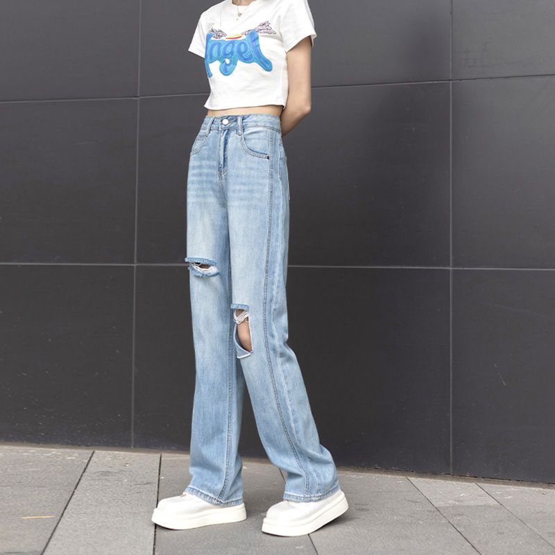 高腰显瘦显高破洞直筒牛仔裤女2025夏新款小个子辣妹拖地裤ins潮